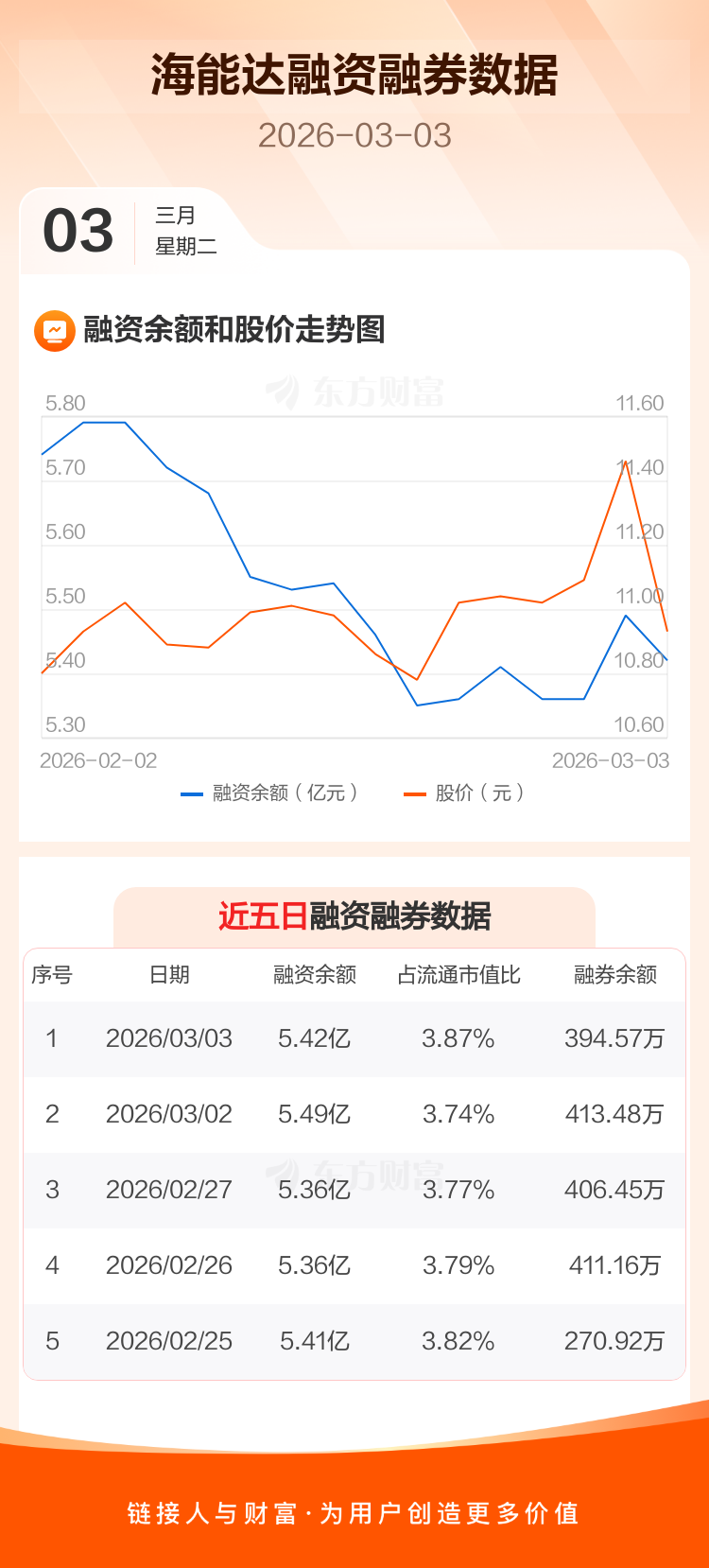 交易所最新数据显示,海能达于2026年3月3日获融资买入3461.52万元,融资偿还4164.26万元,当日融资净偿还702.74万元。目前,该股融资余额5.42亿,占流通市值比例为3.87%。