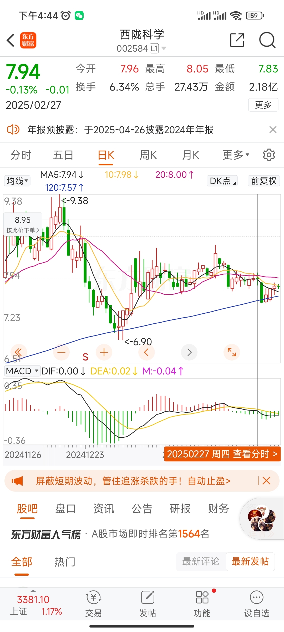 $西陇科学(SZ002584)$ 我发现上周四收的十字星是跌0.13个点,周五暴跌5个多点,今天也是收跌0.13个点的十字星,不知道明天星期五跌多少个点呢?会不会一步跌到位跌到7元形成双底呢?