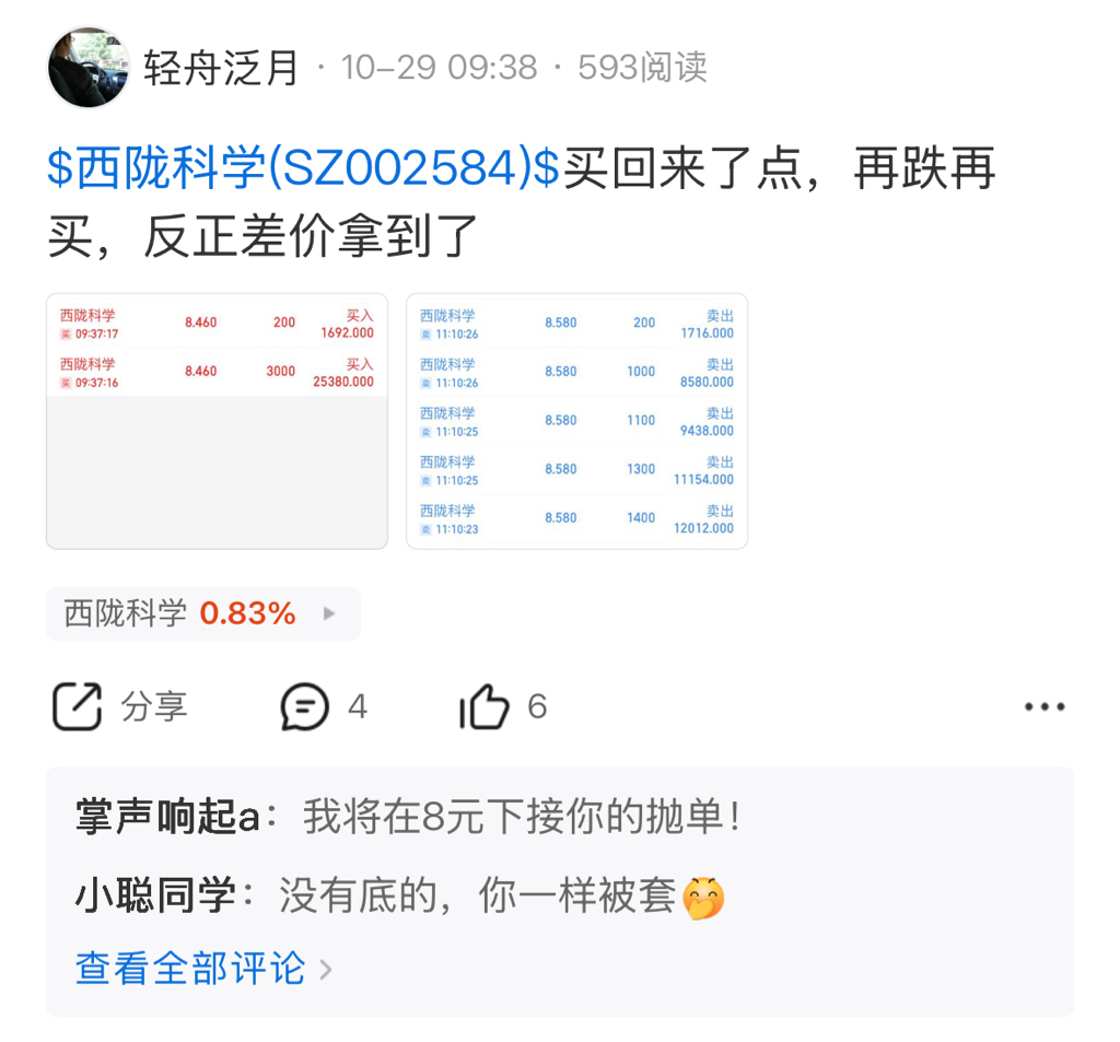 $西陇科学(SZ002584)$ 那个说8元以下接我抛单的托儿,不好意思,我解套了赚点跑了,不和这穷庄泡蘑菇了。