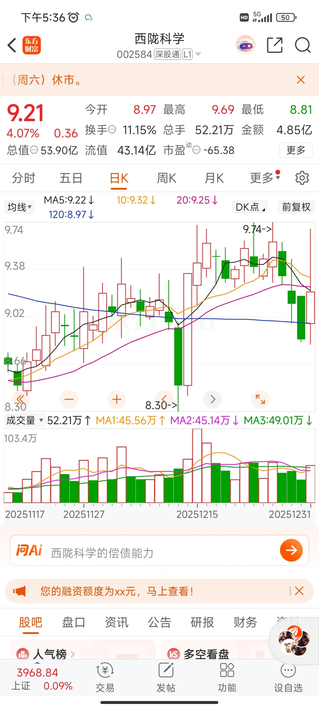 $西陇科学(SZ002584)$ 我9元接的筹码今天9.5元清仓了,今天冲高回落放量滞涨收那么长的上影线,潮汕庄下周一必定继续砸盘,我发现这货做T很有规律,早盘都是拉一下,到尾盘就跳水,我下周一开始就每天尾盘跌的时候就买,第二天红的时候就清仓,来回做T吃肉