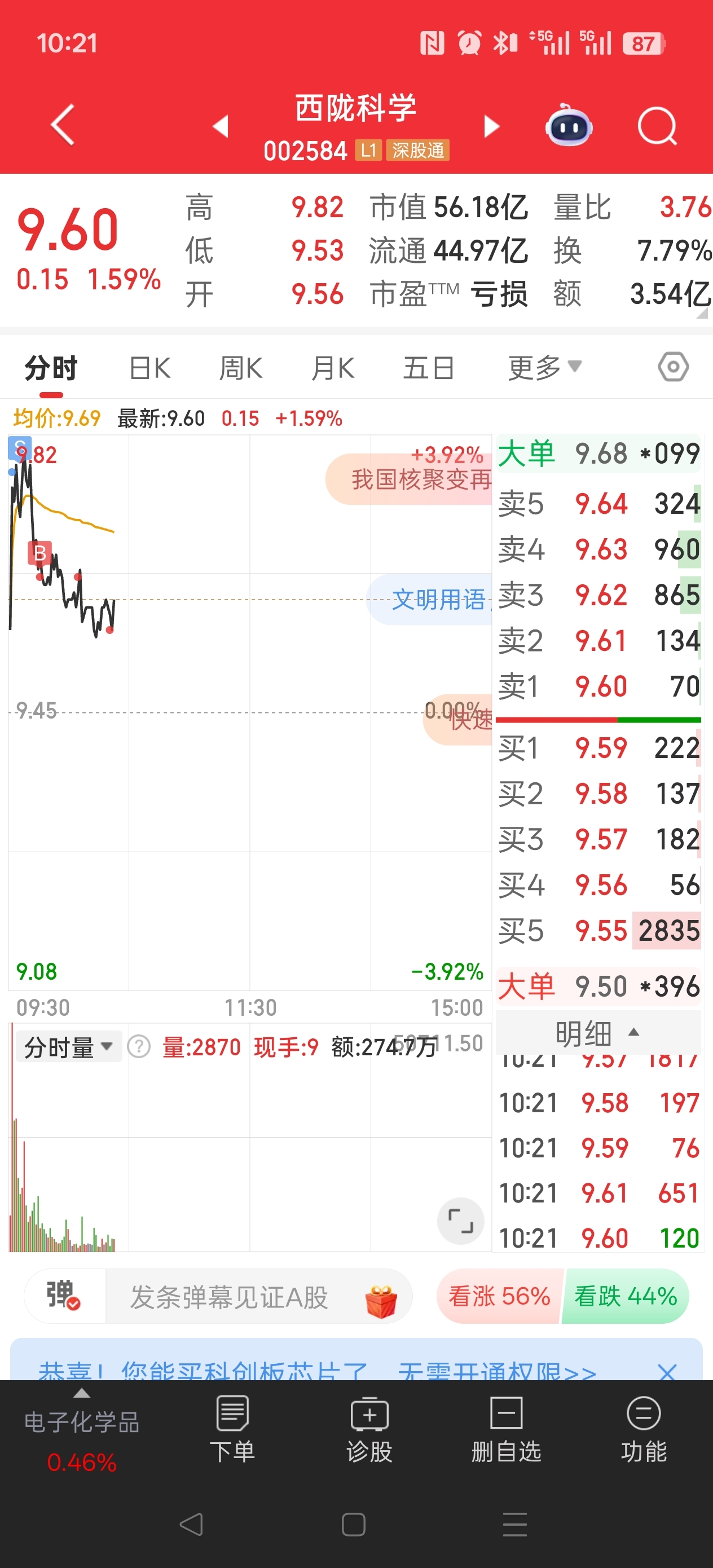 $西陇科学(SZ002584)$ 曼哥每天都只敢高抛一半,今天977卖了100手,956补回来了
