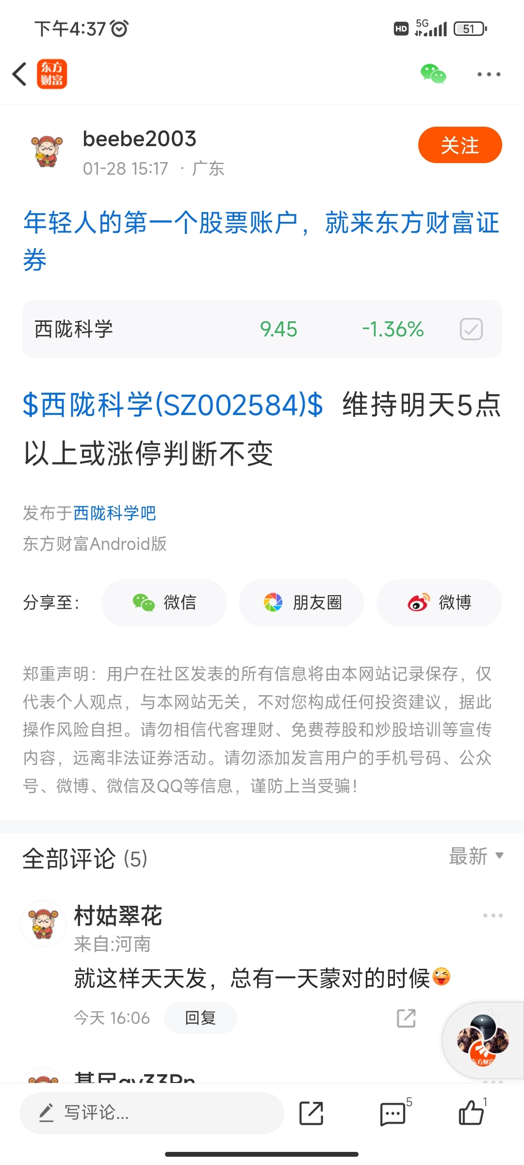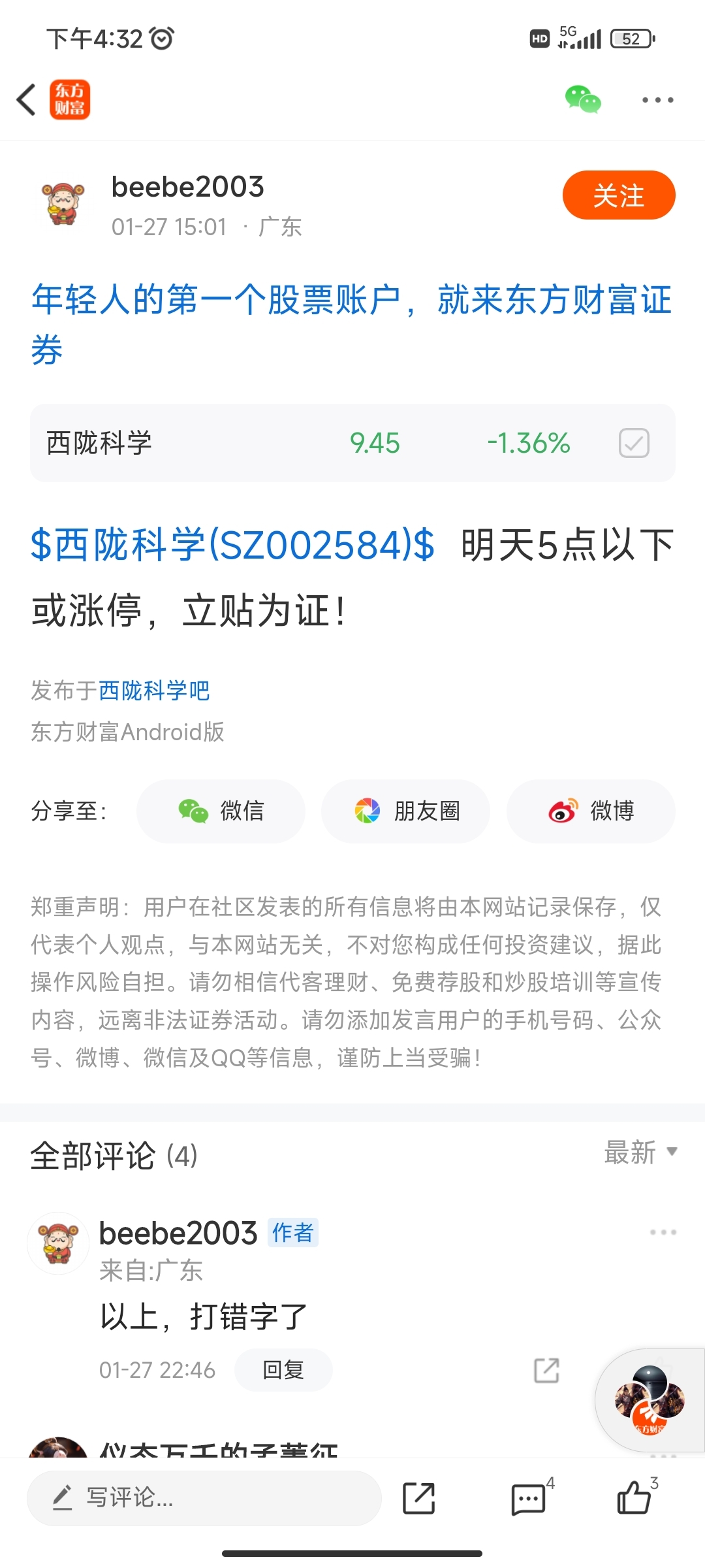 温馨提示: 1.根据《证券法》规定,禁止编造、传播虚假信息或者误导性信息,扰乱证券市场;2.用户在本社区发表的所有资料、言论等仅代表个人观点,与本网站立场无关,不对您构成任何投资建议。用户应基于自己的独立判断,自行决定证券投资并承担相应风险。《东方财富社区管理规定》