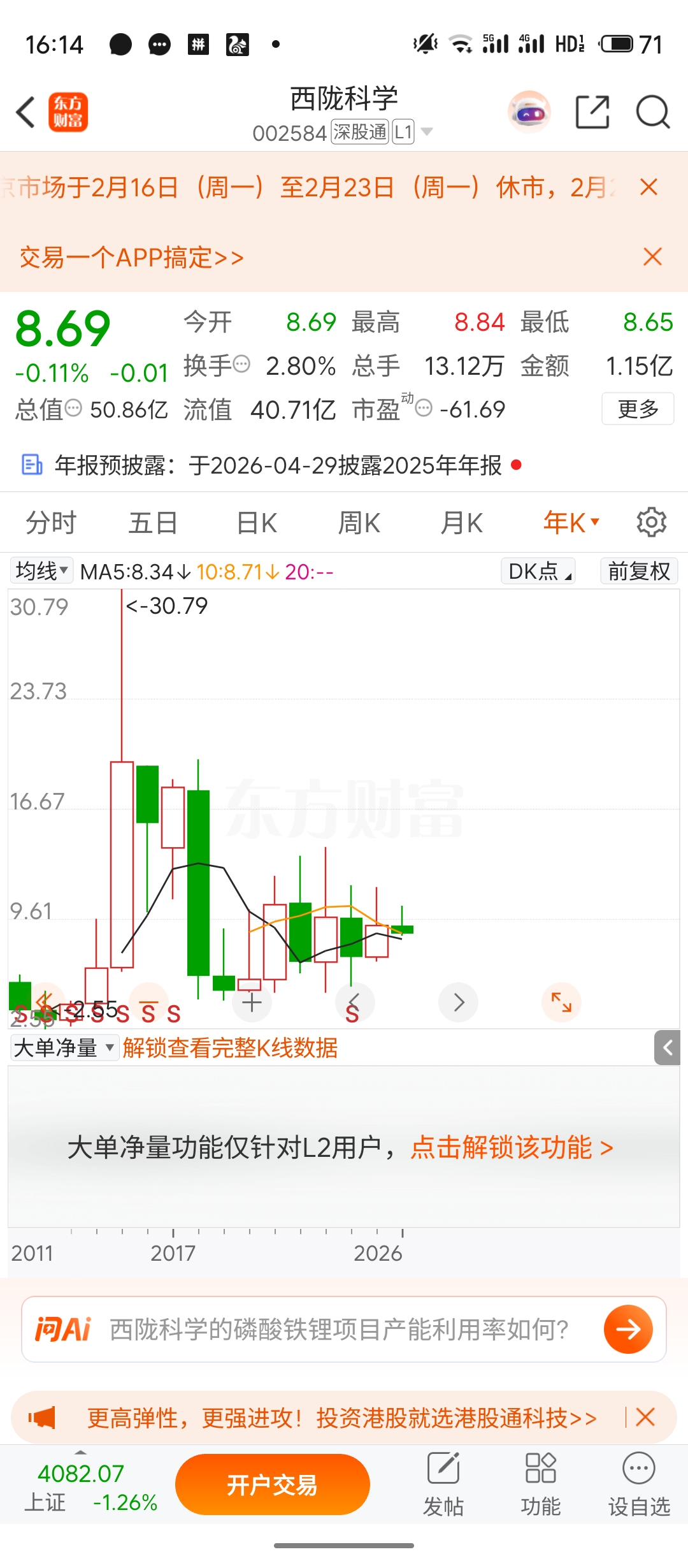 $西陇科学(SZ002584)$ 年线真有规律,近六年都是一红一绿,绿的幅度是红的一半,