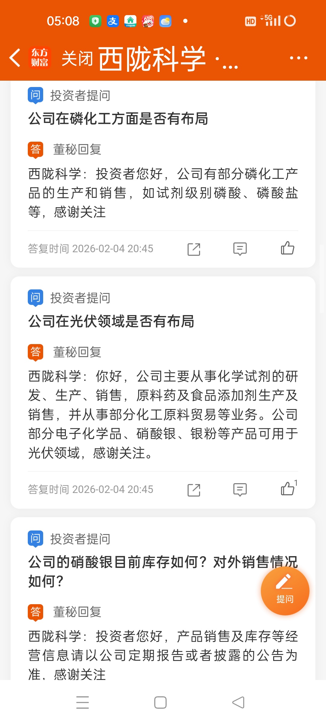 - 你好,公司主要从事化学试剂的研发、生产、销售,原料药及食品添加剂生产及销售,并从事部分化工原料贸易等业务。产品主要应用领域包括半导体、新材料、生物医药、石油化工、新能源等行业。感谢关注