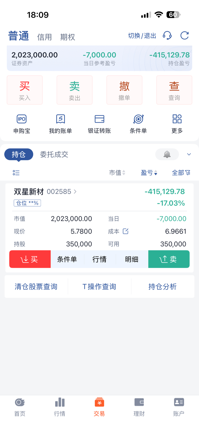 $双星新材(SZ002585)$ 持仓三年多了,在这1157天里就一直跌,我就一直补仓,从25.95补仓到6.96元,股票现在才5.78,我踏马从十来万补到二百多万了,啥时候才能放我出来?不解套我就跟你死磕,谁有我的毅力