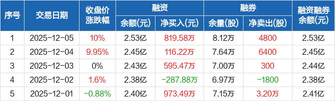 融资方面,当日融资买入5546.73万元,融资偿还4727.14万元,融资净买入819.58万元,连续3日净买入累计1531.27万元。融券方面,融券卖出4800股,融券偿还0股,融券余量8.12万股,融券余额56.27万元。融资融券余额合计2.53亿元。