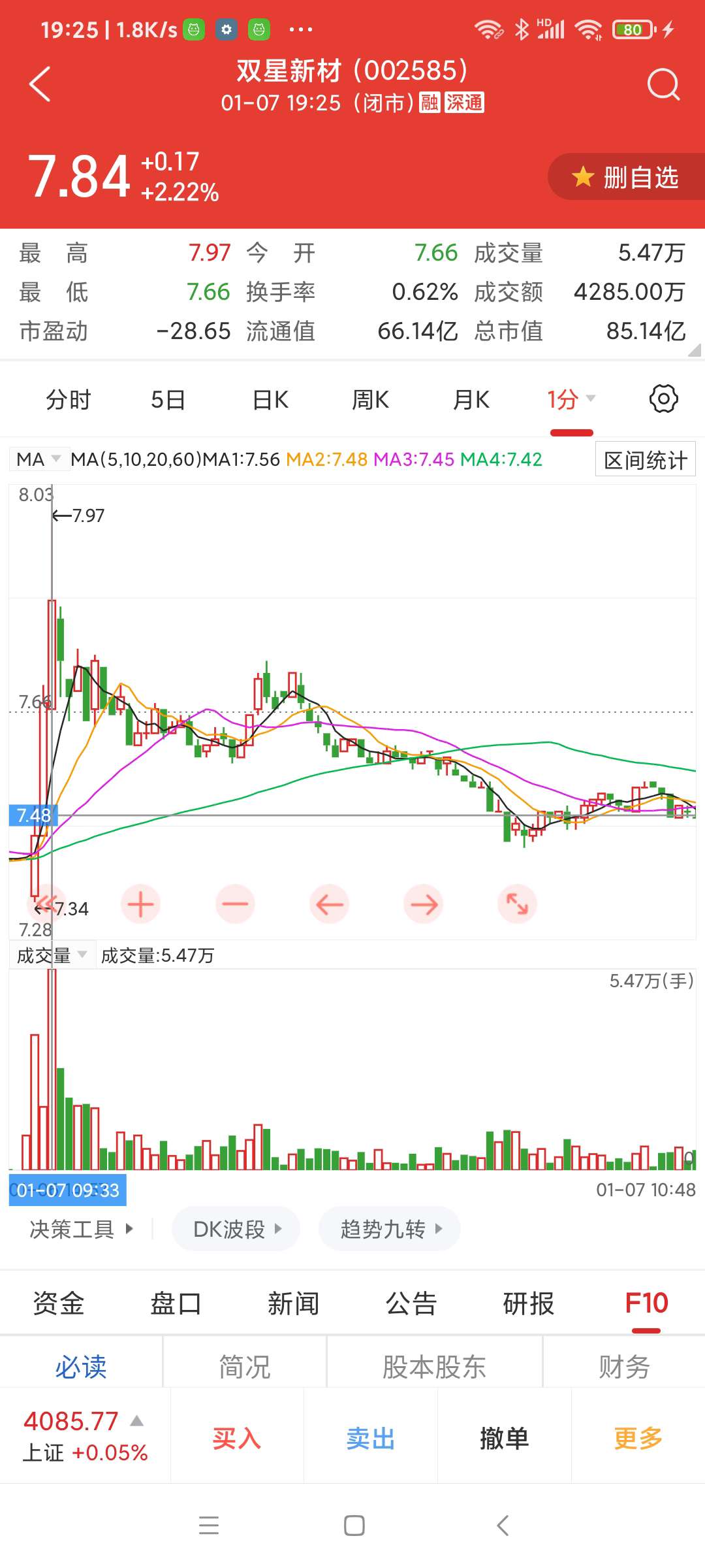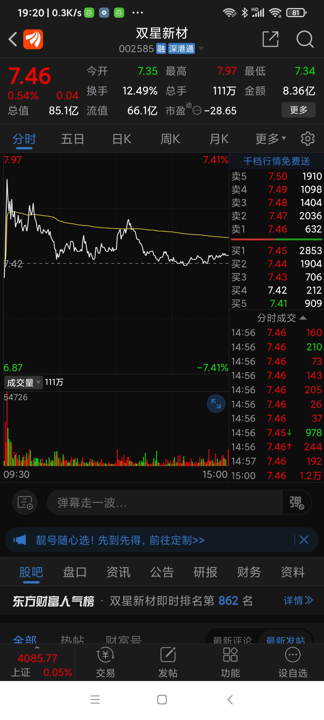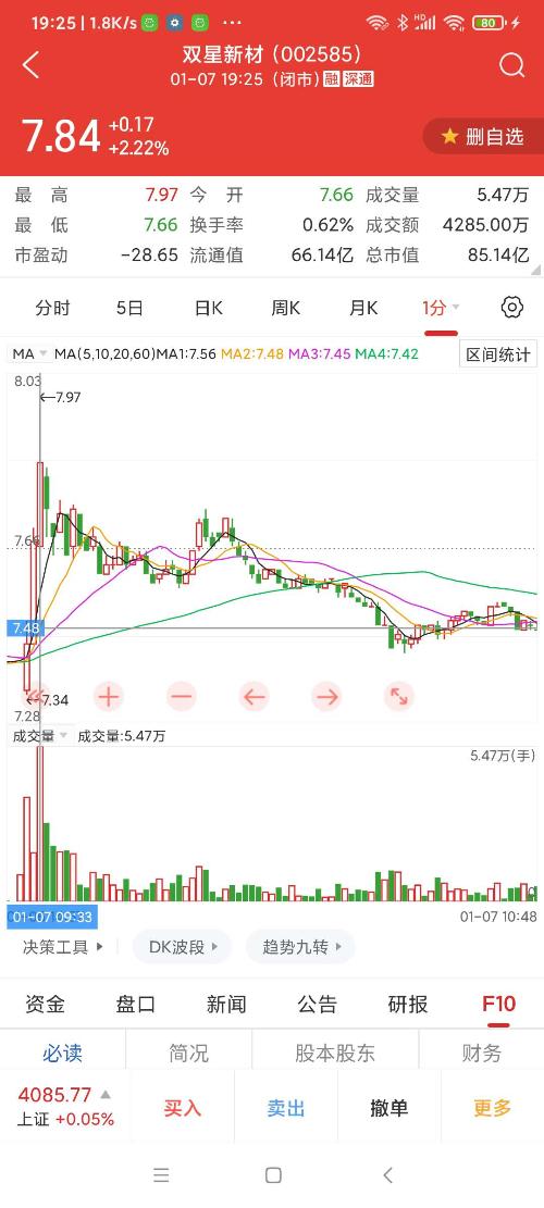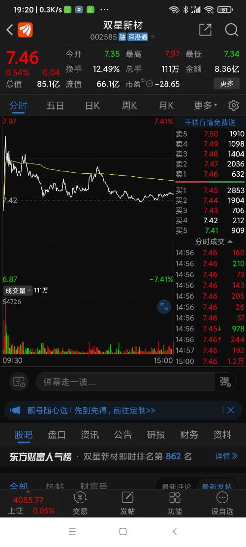 双星新材,今早9:33分拉升时遭遇巨大抛盘,短时看调整。