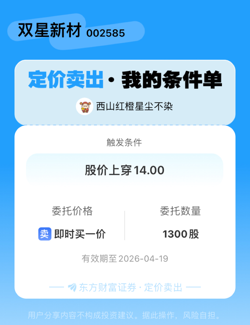 #条件单交流# #定价卖出晒单# 设置了一个定价卖出条件单,接下来就是见证奇迹的时刻~$双星新材(SZ002585)$