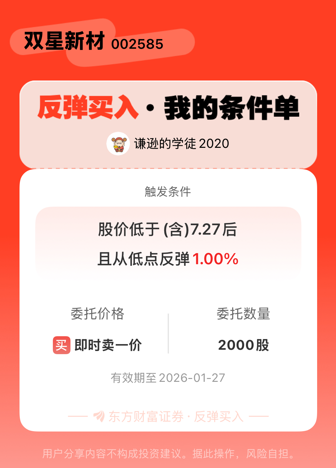 #条件单交流# #反弹买入晒单# 一位股神设置了一个反弹买入条件单,接下来就是见证奇迹的时刻~$双星新材(SZ002585)$