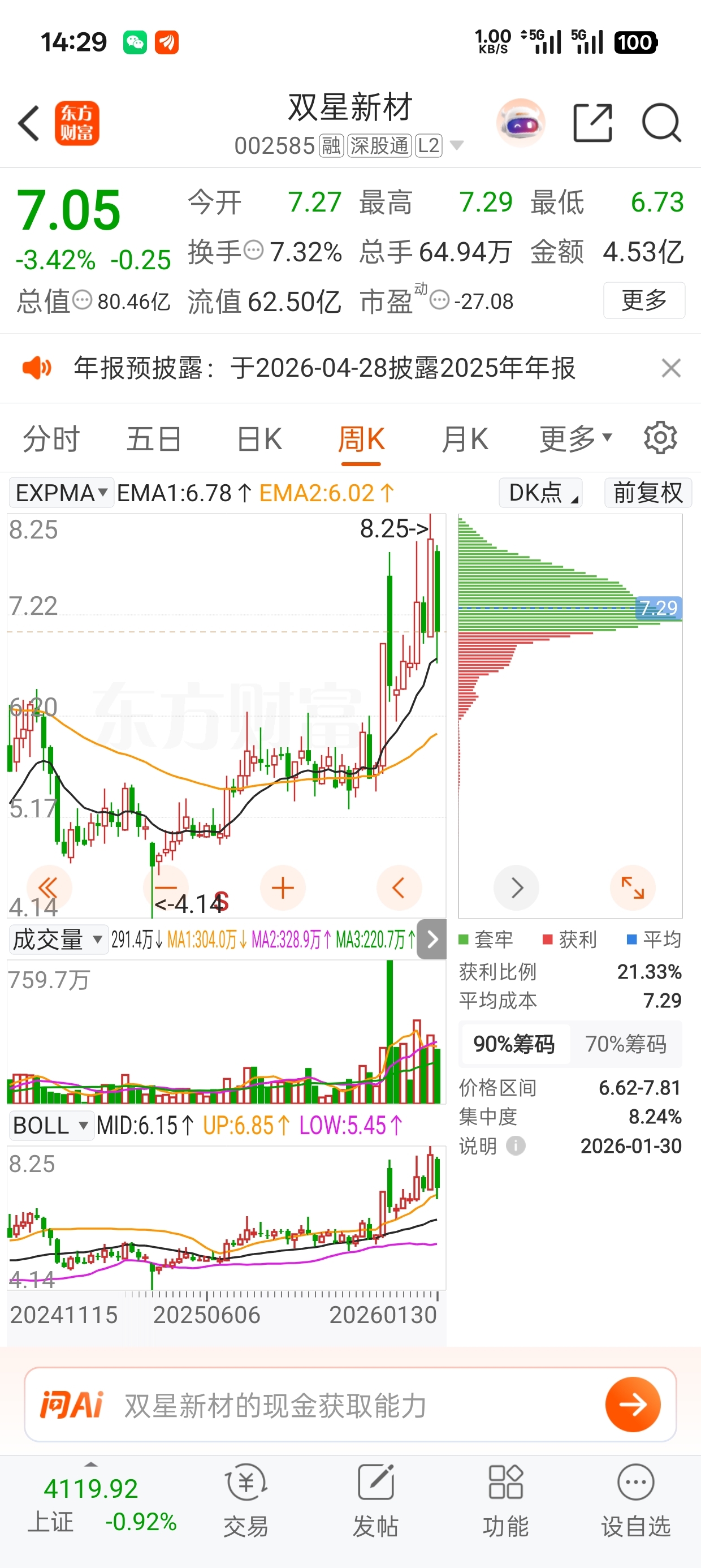 $双星新材(SZ002585)$ 这种把上周阳线吃完的,周线级别的回踩不可避免。