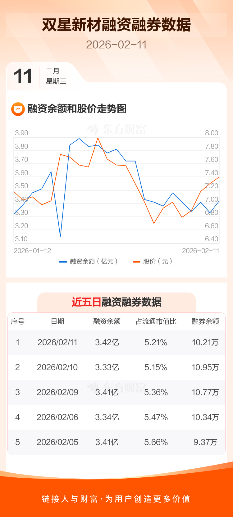 交易所最新数据显示,双星新材于2026年2月11日获融资买入2929.37万元,融资偿还2042.72万元,当日融资净买入886.65万元。目前,该股融资余额3.42亿,占流通市值比例为5.21%。