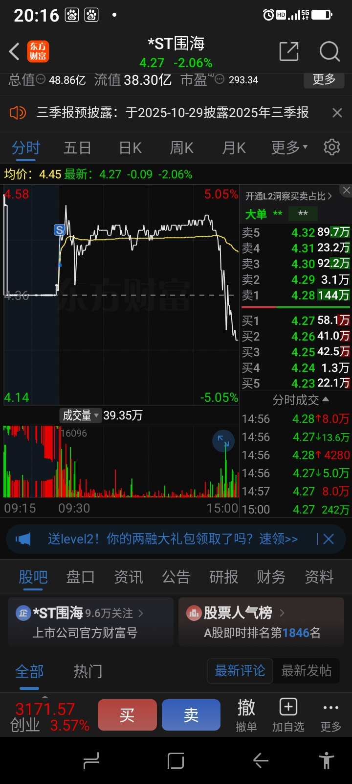 $*ST围海(SZ002586)$ 知道不秒了早上马上跑了