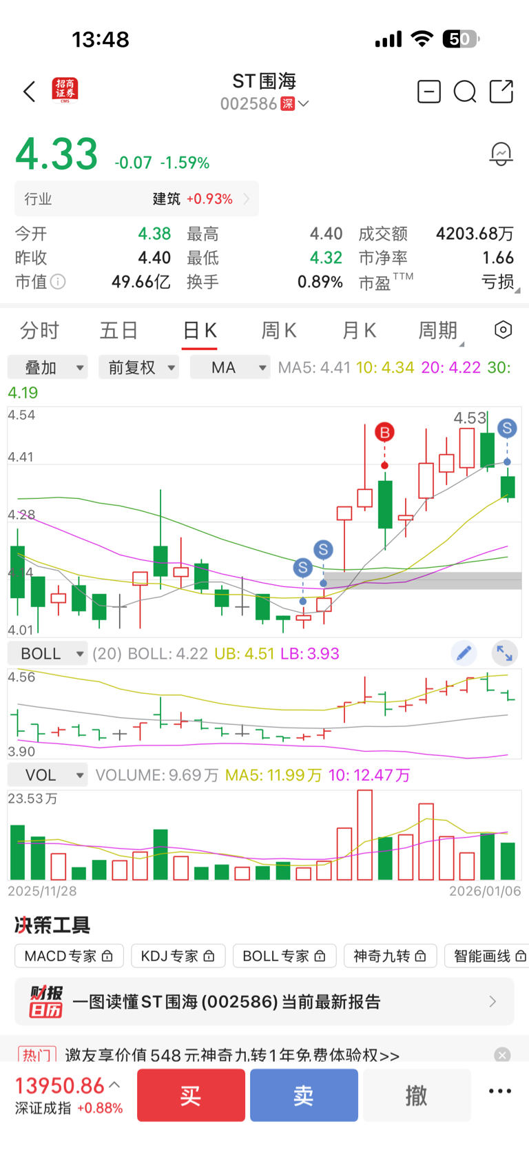 $ST围海(SZ002586)$ 外面行情那么好,走了拜拜,卖一次他就涨,买它就下跌,