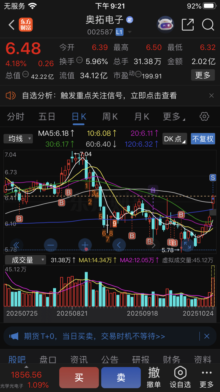 $奥拓电子(SZ002587)$ 唉!套了两个多月今天解套了一半!