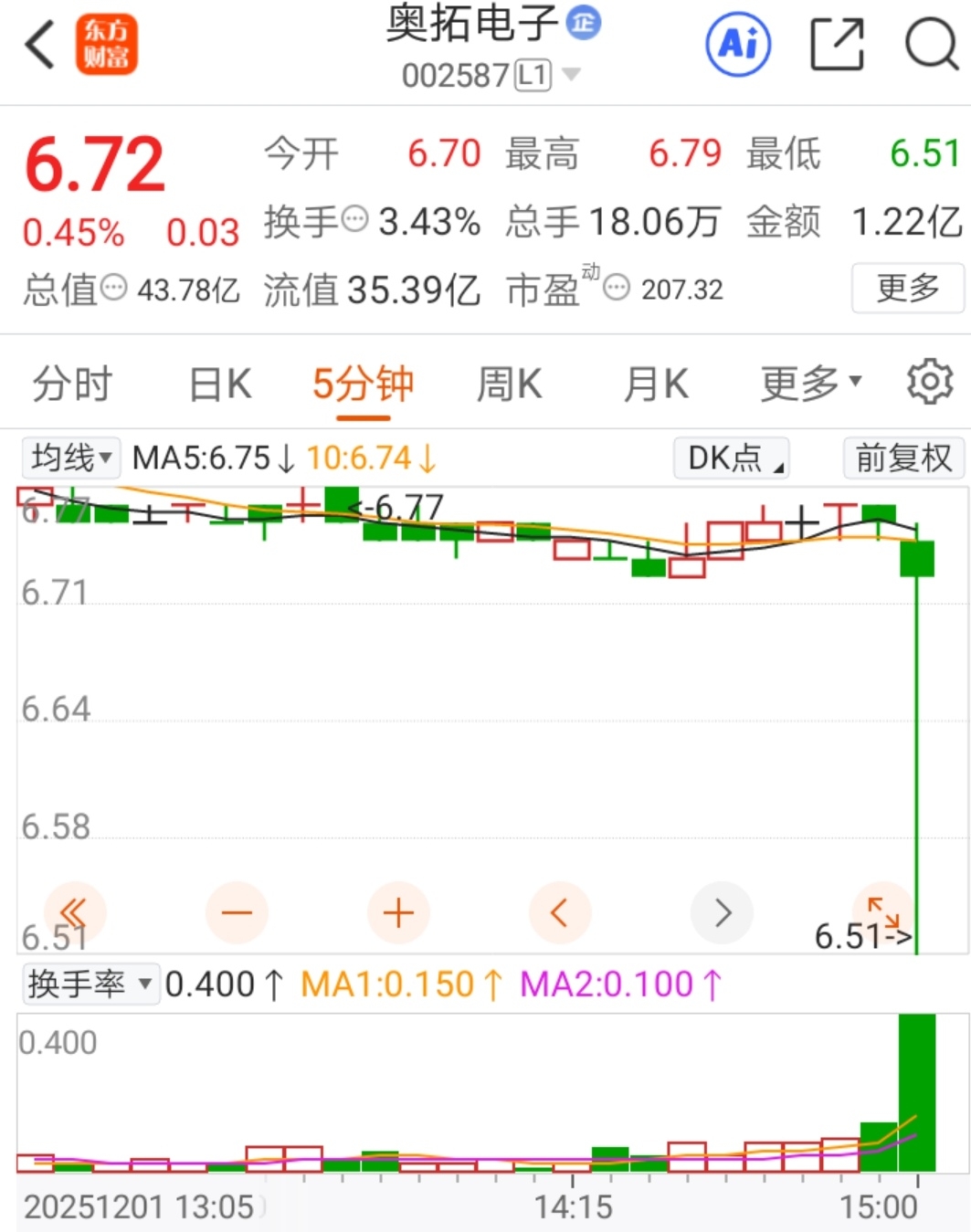 $奥拓电子(SZ002587)$ 这么长的下影线……