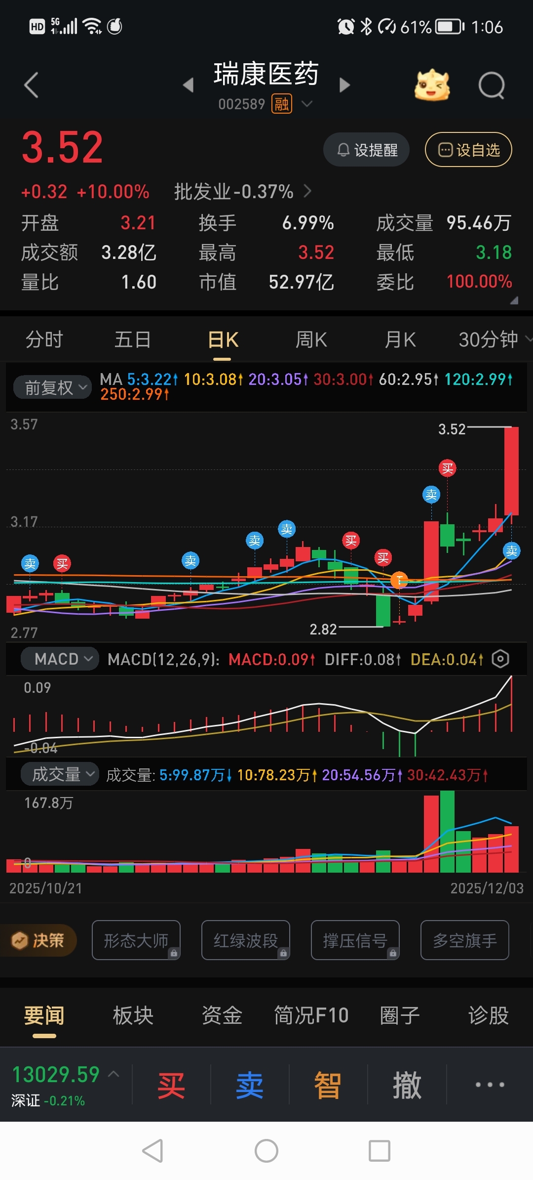 $瑞康医药(SZ002589)$ 见好就收,边涨边卖。拿好手中底仓筹码原地卧倒!