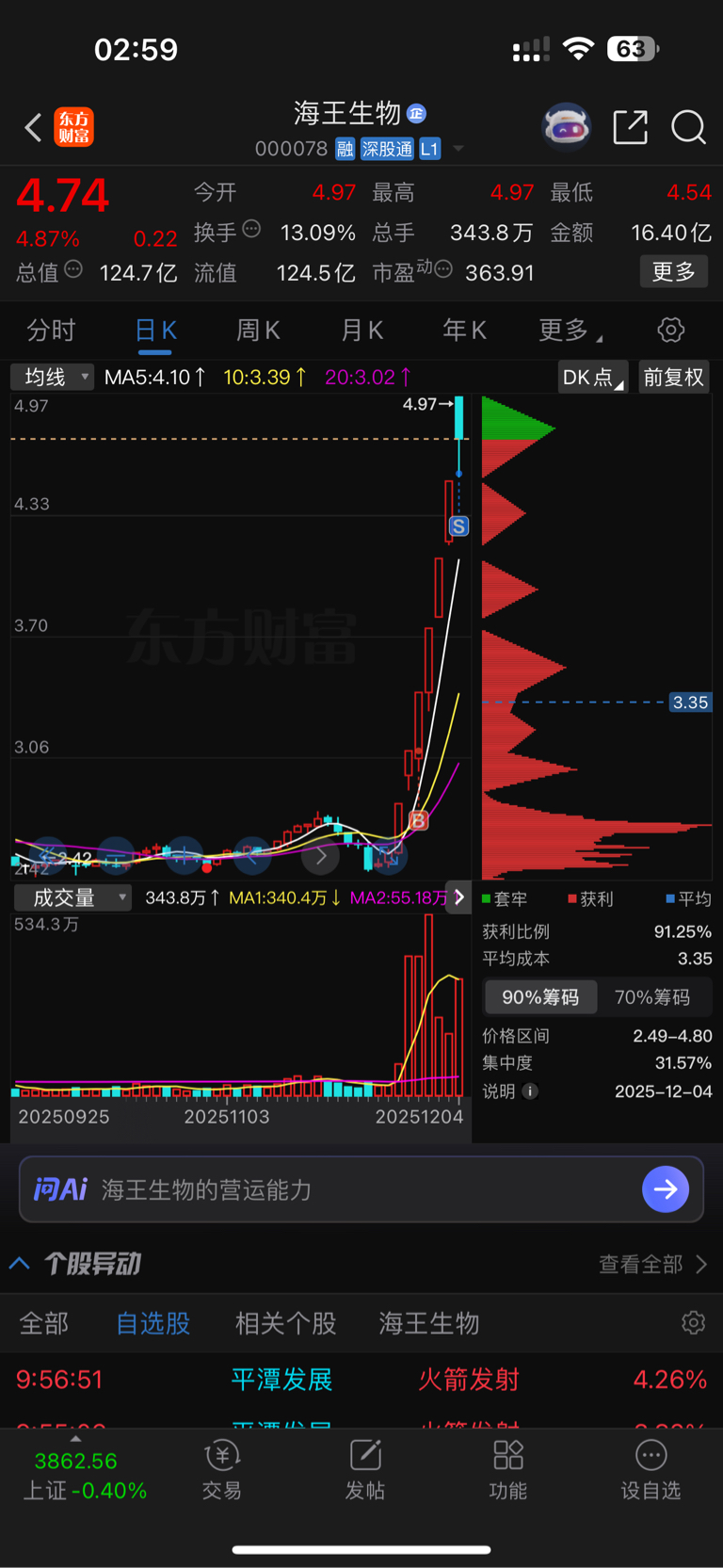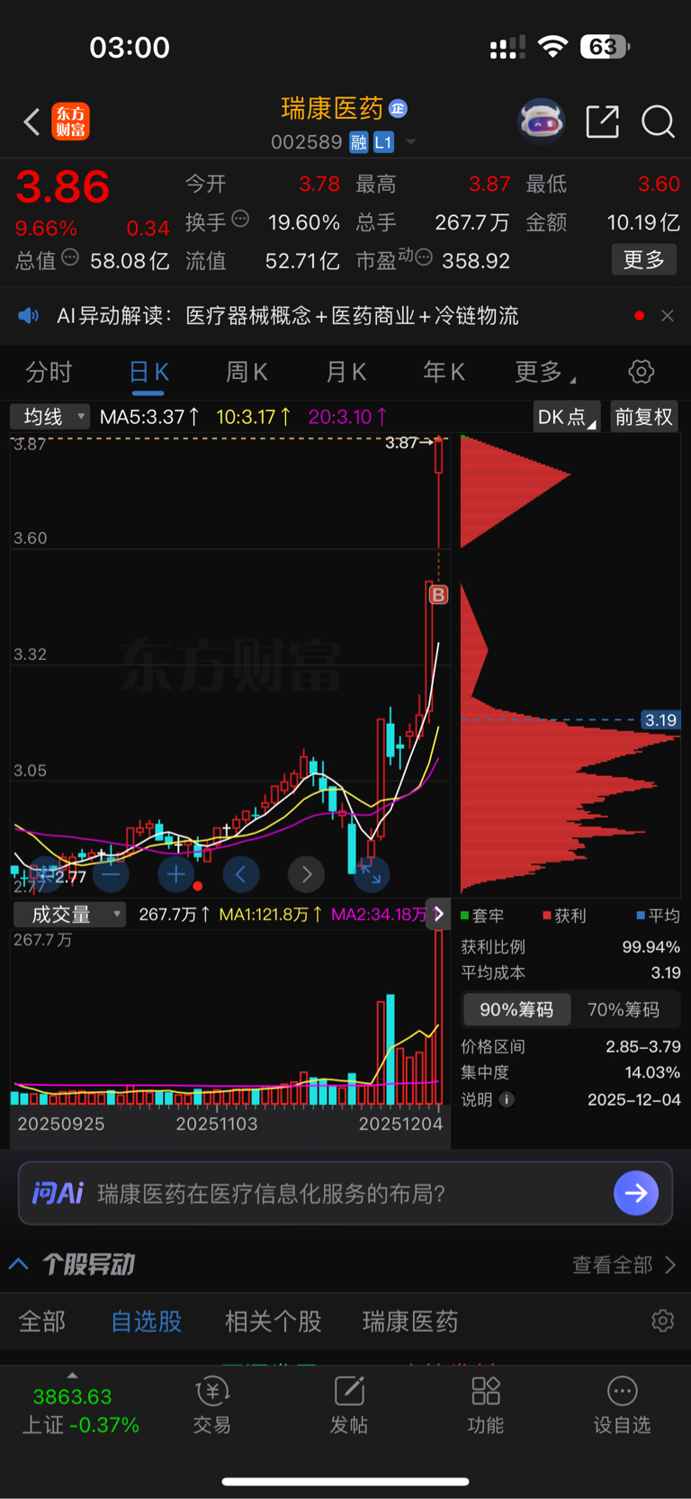$瑞康医药(SZ002589)$ $安记食品(SH603696)$ $航天机电(SH600151)$ 大盘走势向下,市场风格逐渐进入高低切的模式,例如军工航天的航天机电,消费食品的安记食品,以及医药的瑞康医药。今作:海王切瑞康