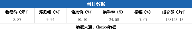 深交所2025年12月4日交易公开信息显示,瑞康医药因属于当日涨幅偏离值达7%的证券、连续三个交易日内收盘价格涨幅偏离值累计20%而登上龙虎榜。瑞康医药当日报收3.87元,涨跌幅为9.94%,偏离值达10.10%,换手率24.58%,振幅7.67%,成交额12.82亿元。