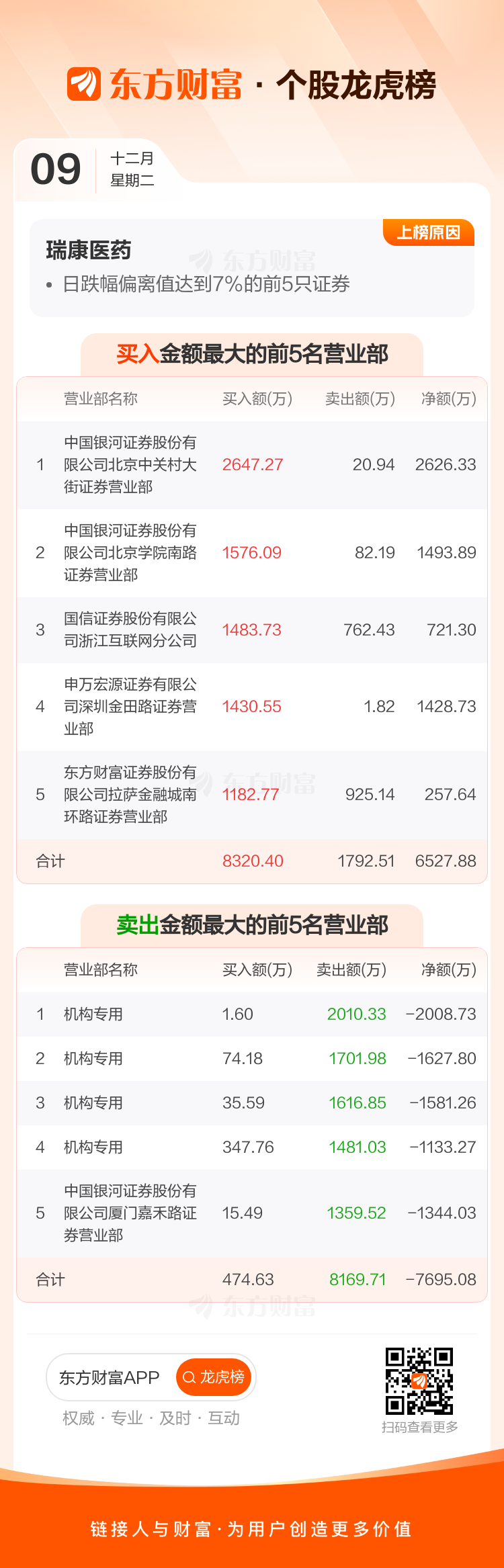 交易所2025年12月9日公布的交易公开信息显示,瑞康医药因成为日跌幅偏离值达到7%的前5只证券上榜。瑞康医药当日收报4.22元,涨跌幅-10.02%,偏离值-9.48%,换手率17.26%,成交额10.05亿。