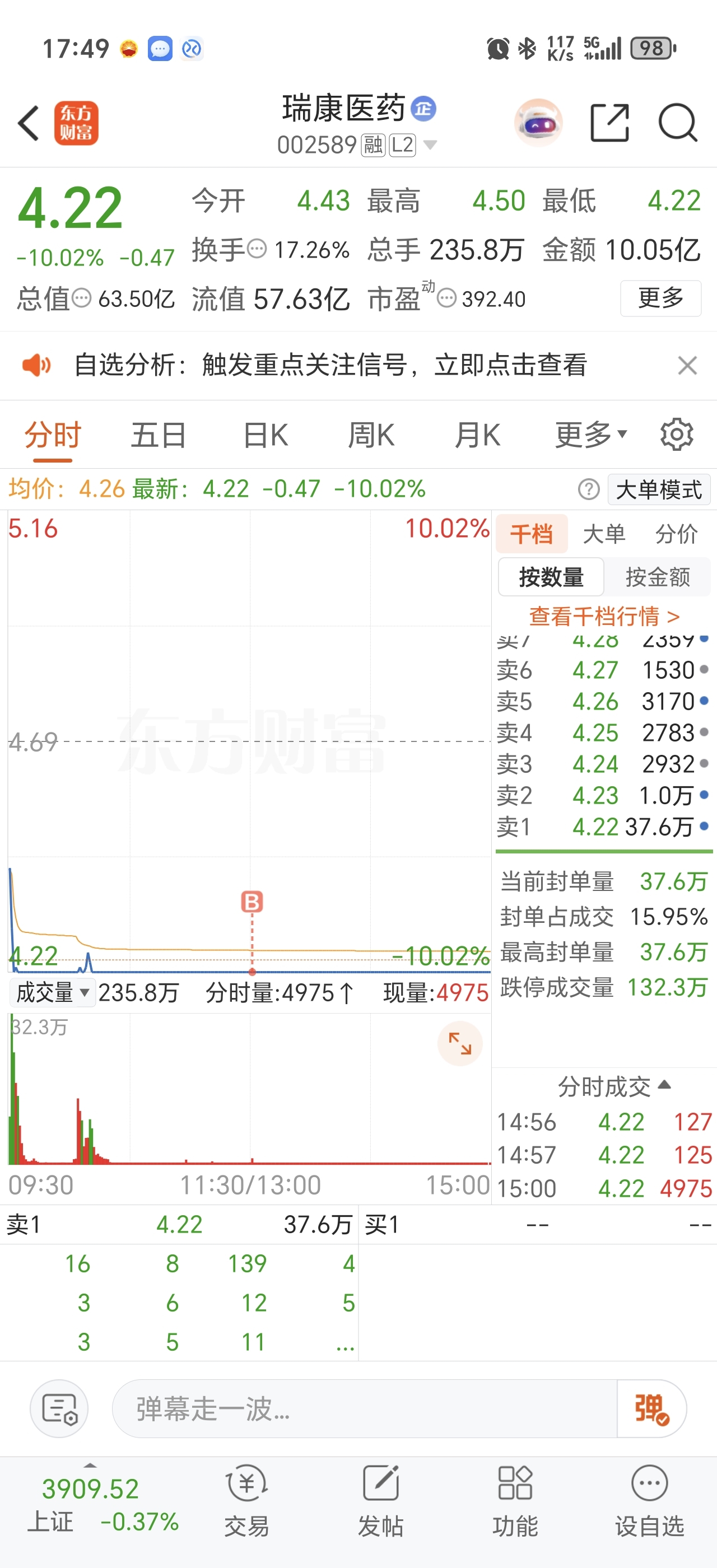 $瑞康医药(SZ002589)$ 明天高开涨停的几率很大
