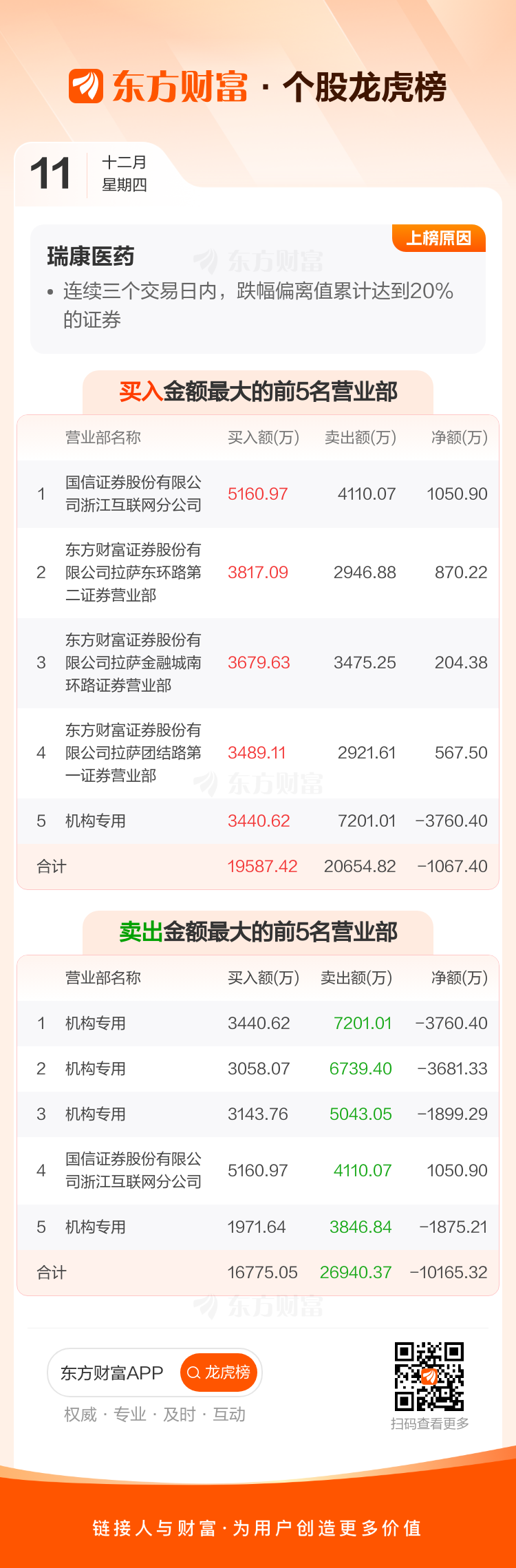 交易所2025年12月11日公布的交易公开信息显示,瑞康医药因成为连续三个交易日内,跌幅偏离值累计达到20%的证券上榜。瑞康医药当日收报3.55元,涨跌幅-8.97%,换手率21.95%,成交额10.93亿。异常期间12月9日至12月11日,期间涨幅-24.31%,累计偏离值-22.64%,区间成交额36.48亿。