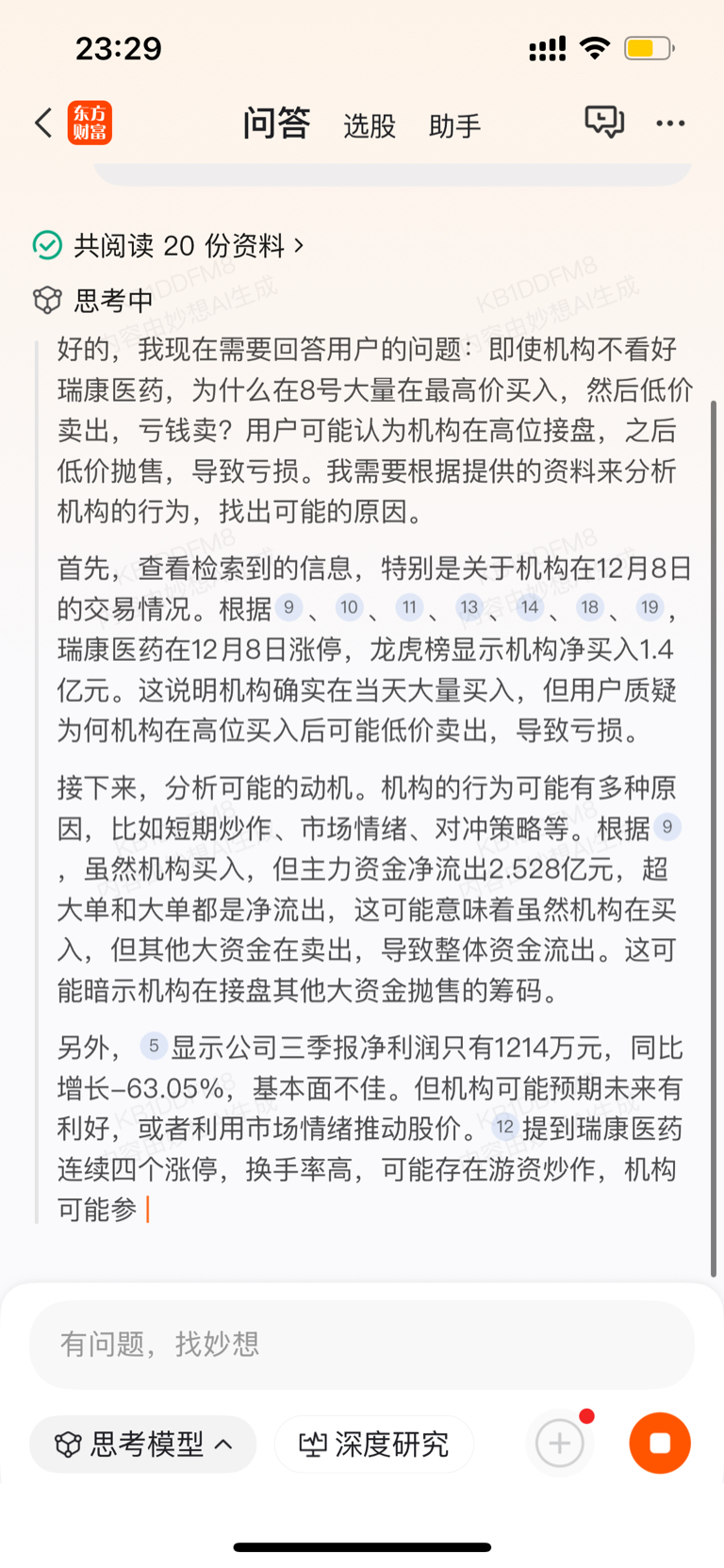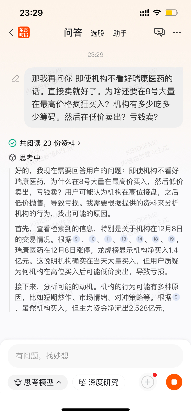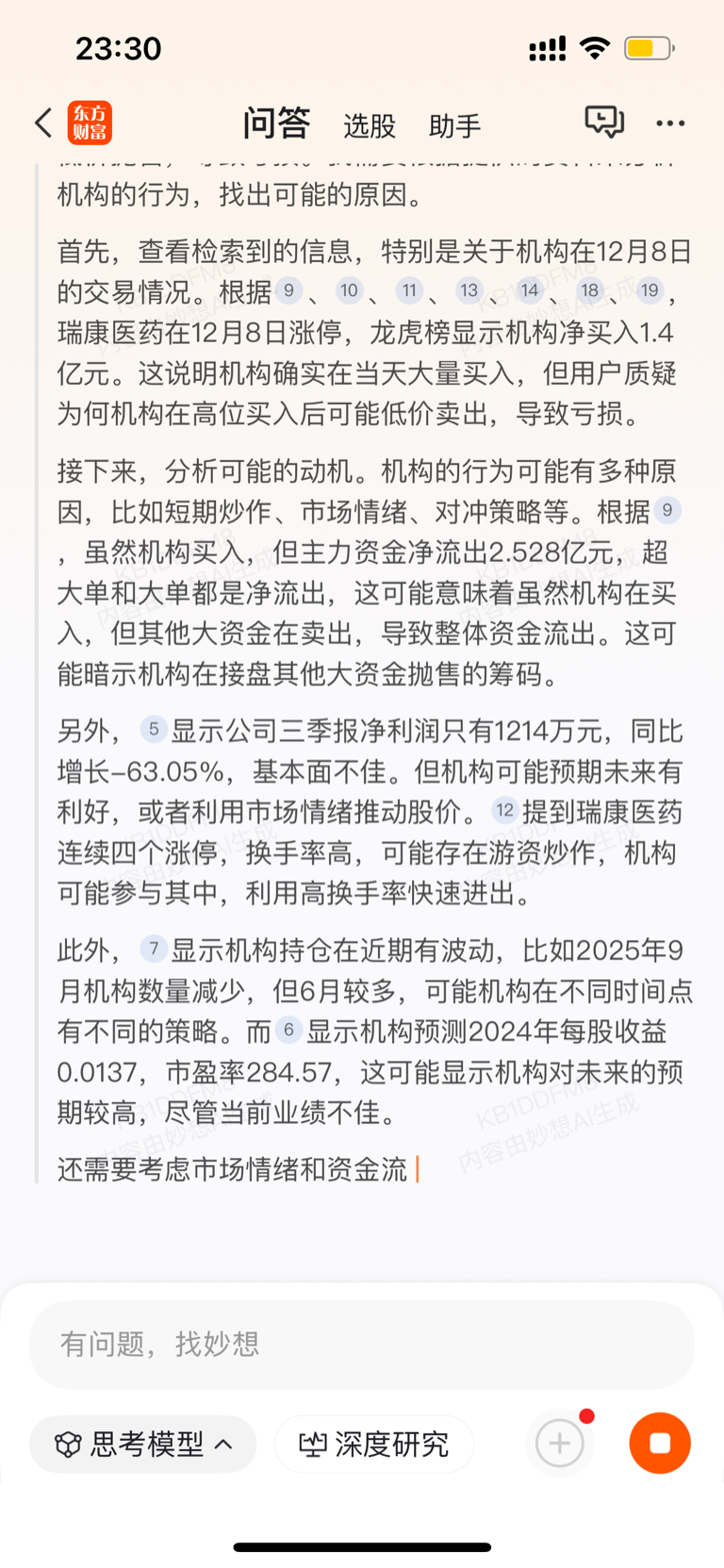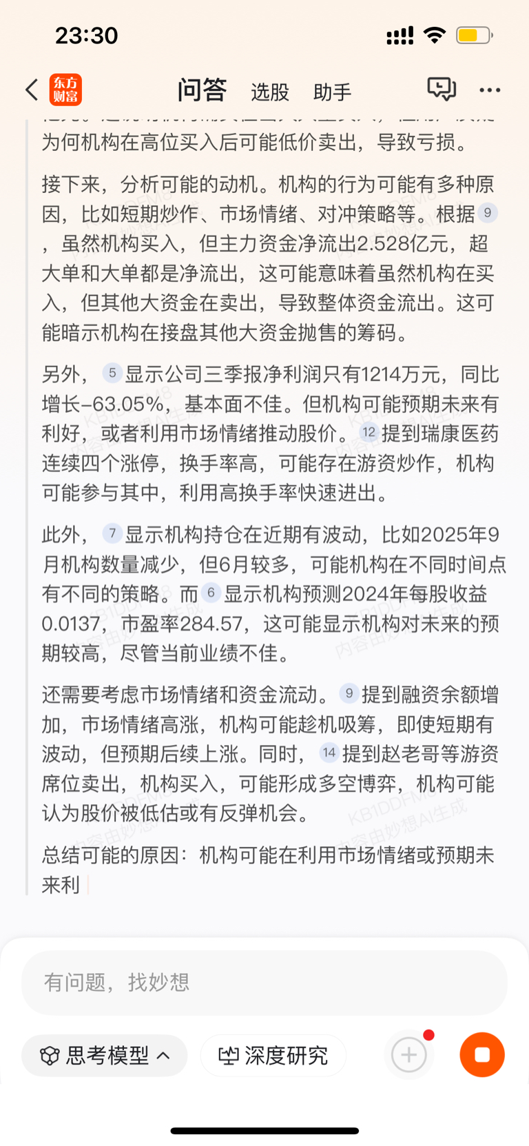 $瑞康医药(SZ002589)$ 很有意思的是我问妙妙:“那我再问你 即使机构不看好瑞康医药的话。直接卖就好了。为啥还要在8号大量在最高价格疯狂买入?机构有多少吃多少筹码。然后在低价卖出?亏钱卖?”回答一半既然屏蔽了。这是我的截图