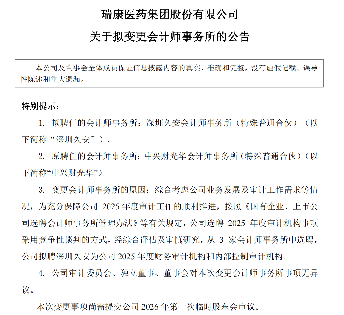 瑞康医药12月24日晚突发公告,宣布终止与中兴财光华会计师事务所的合作,改聘深圳久安承接2025年度审计业务。而按惯例,A股公司的年报审计基本于次年1月启动、4月底前完成。对于变更理由,公司在公告中仅含糊提到“综合考虑公司业务发展及审计工作需求”。