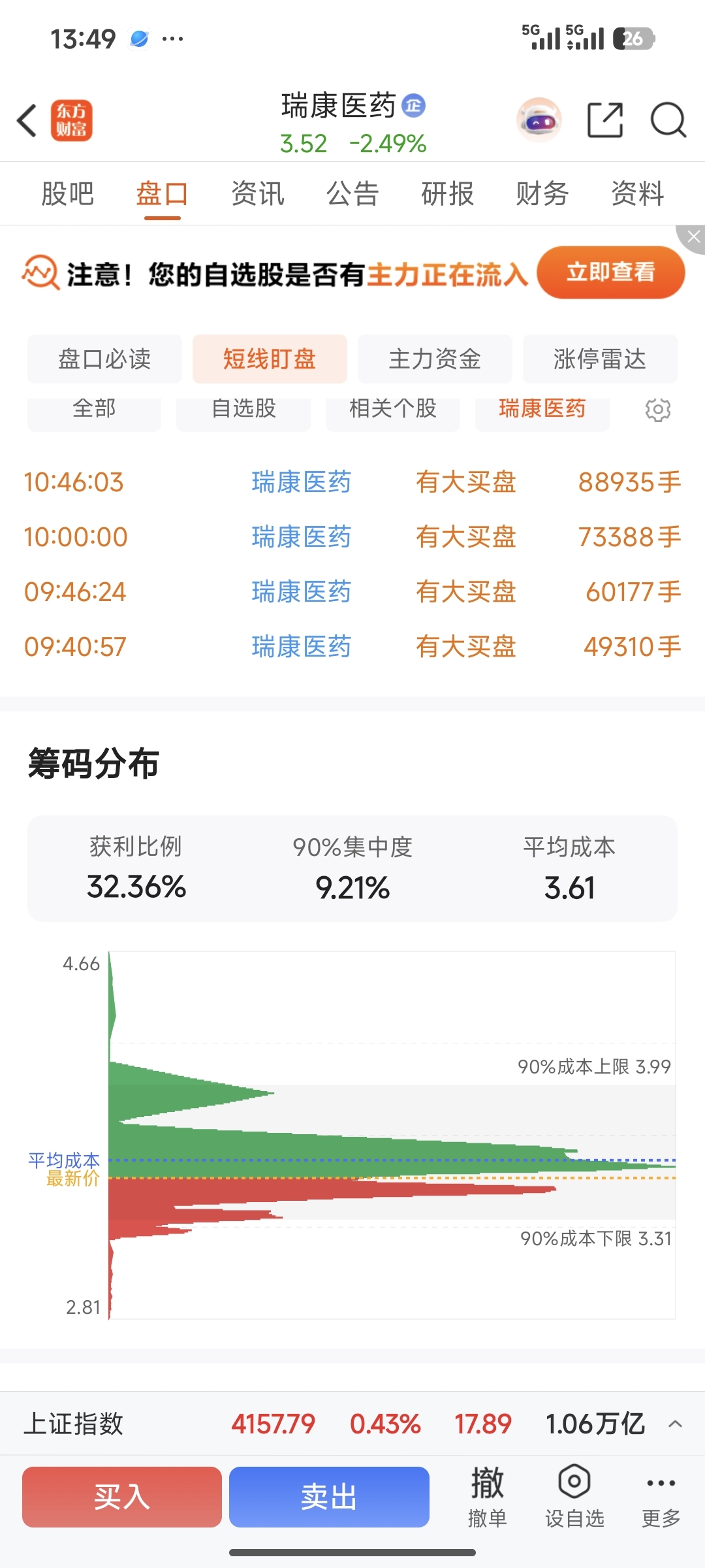 $瑞康医药(SZ002589)$ 猪力你还可以再恶心点吗?天天而已挂大盘买入