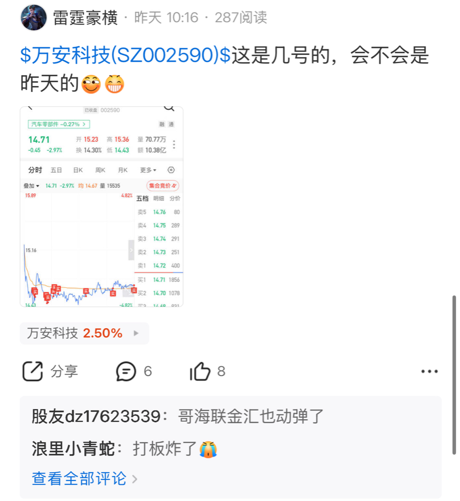 温馨提示: 1.根据《证券法》规定,禁止编造、传播虚假信息或者误导性信息,扰乱证券市场;2.用户在本社区发表的所有资料、言论等仅代表个人观点,与本网站立场无关,不对您构成任何投资建议。用户应基于自己的独立判断,自行决定证券投资并承担相应风险。《东方财富社区管理规定》