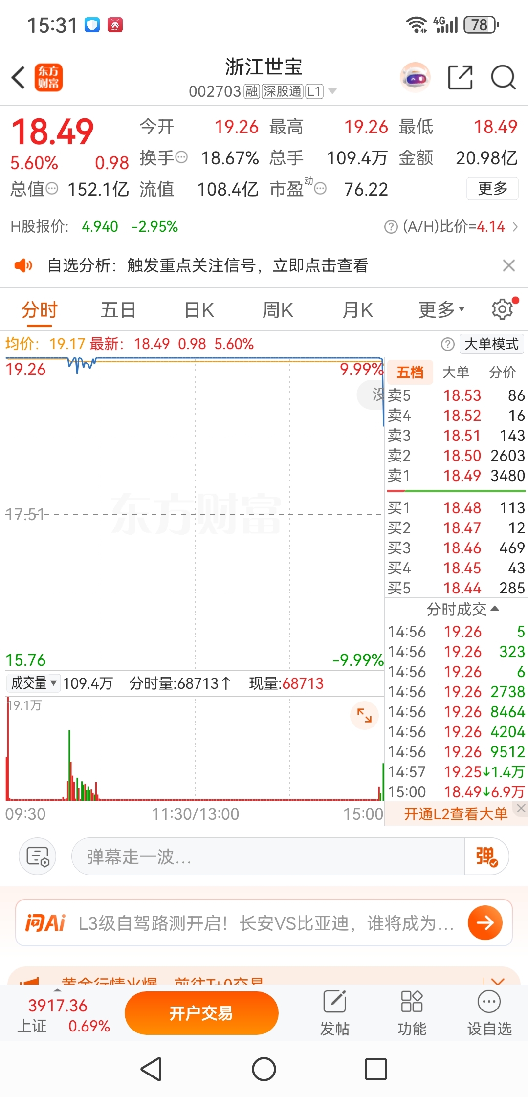 浙江世宝一秒钟能跌5个点,我国高科技全部用在对付散户了,两秒钟能把浙江世宝砸跌停板,堪称世界奇蹟。