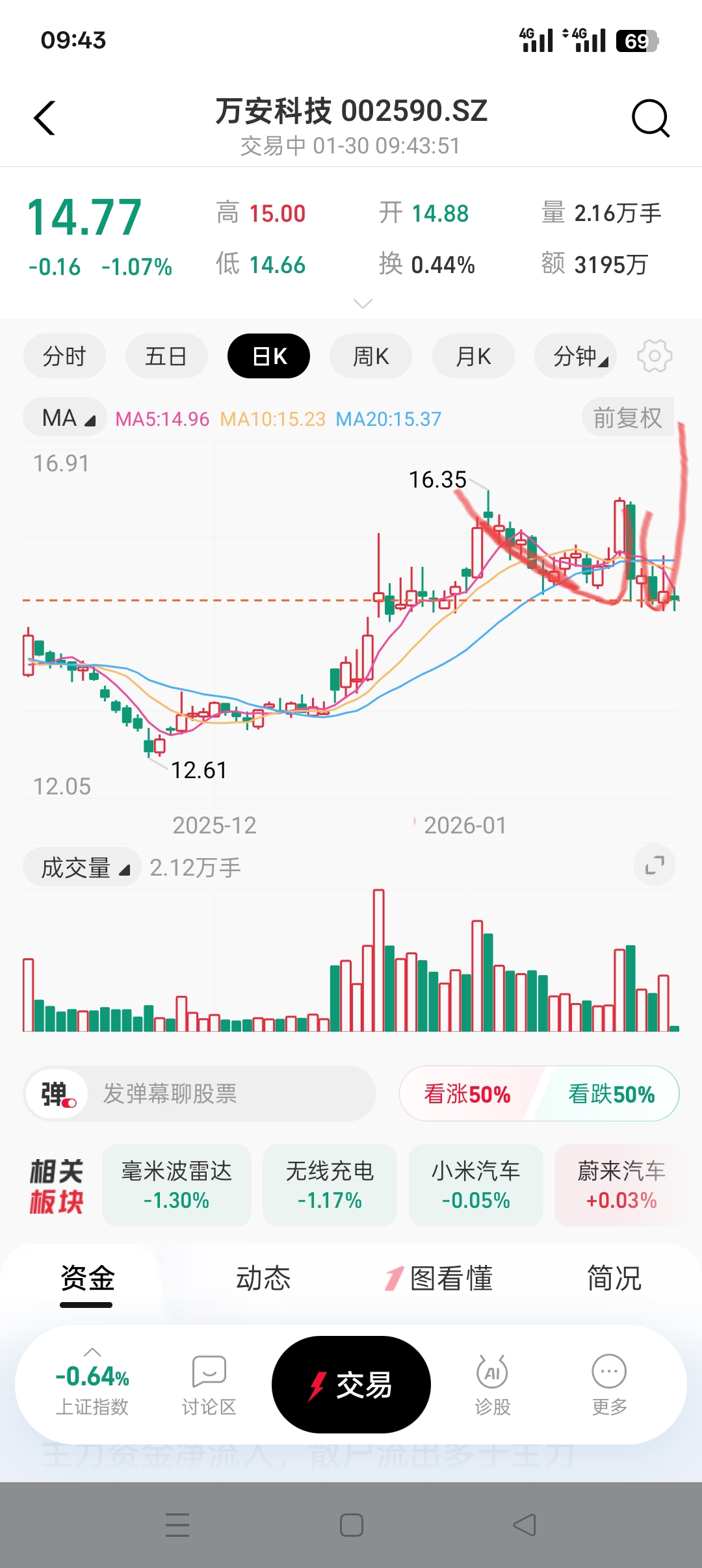$万安科技(SZ002590)$ W形态,一步冲天突破前高