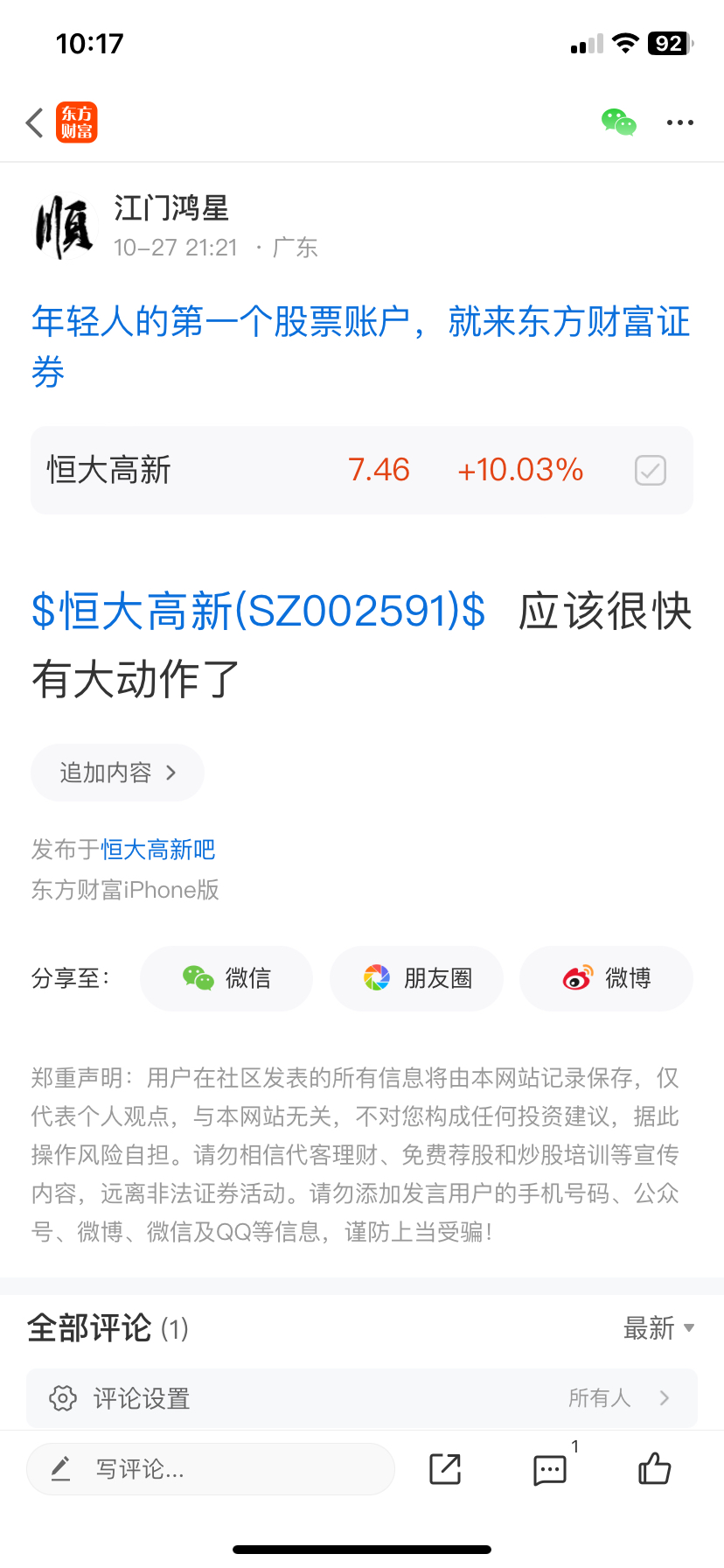 温馨提示: 1.根据《证券法》规定,禁止编造、传播虚假信息或者误导性信息,扰乱证券市场;2.用户在本社区发表的所有资料、言论等仅代表个人观点,与本网站立场无关,不对您构成任何投资建议。用户应基于自己的独立判断,自行决定证券投资并承担相应风险。《东方财富社区管理规定》