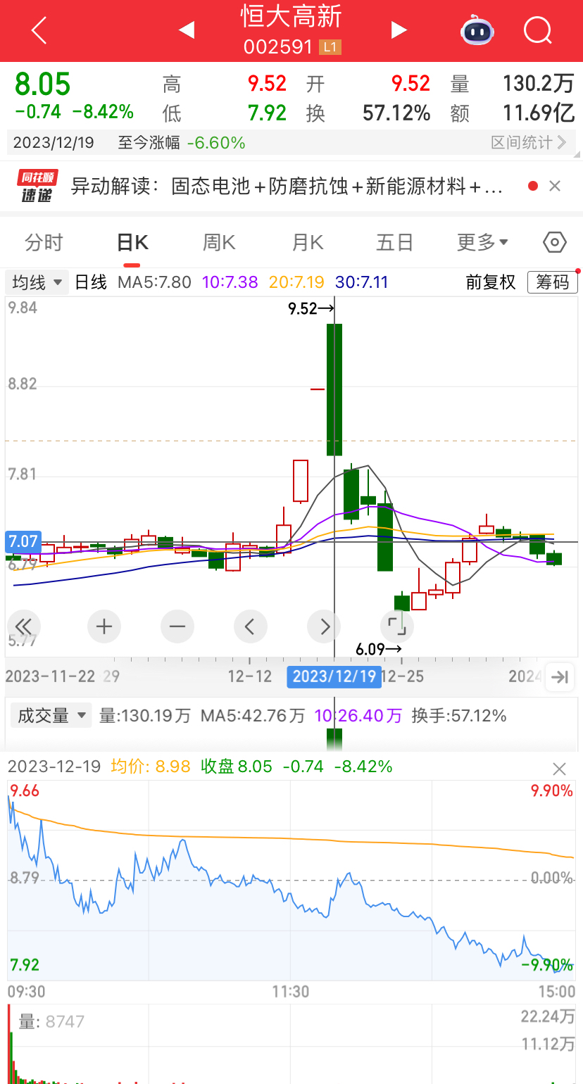 $恒大高新(SZ002591)$ 不经过爆量超过10个亿的市场检验不接 容易吃天地板