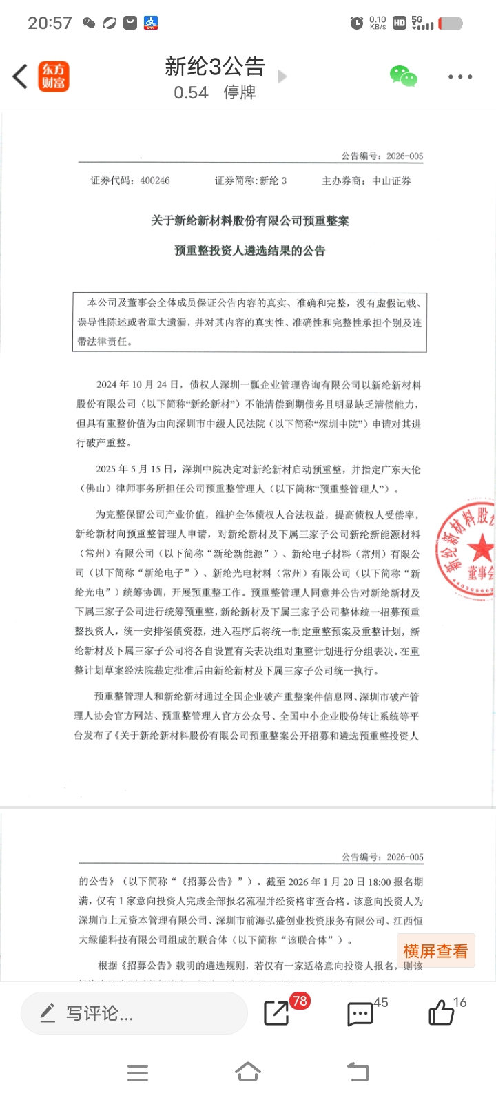 $恒大高新(SZ002591)$ 新纶新材预重整