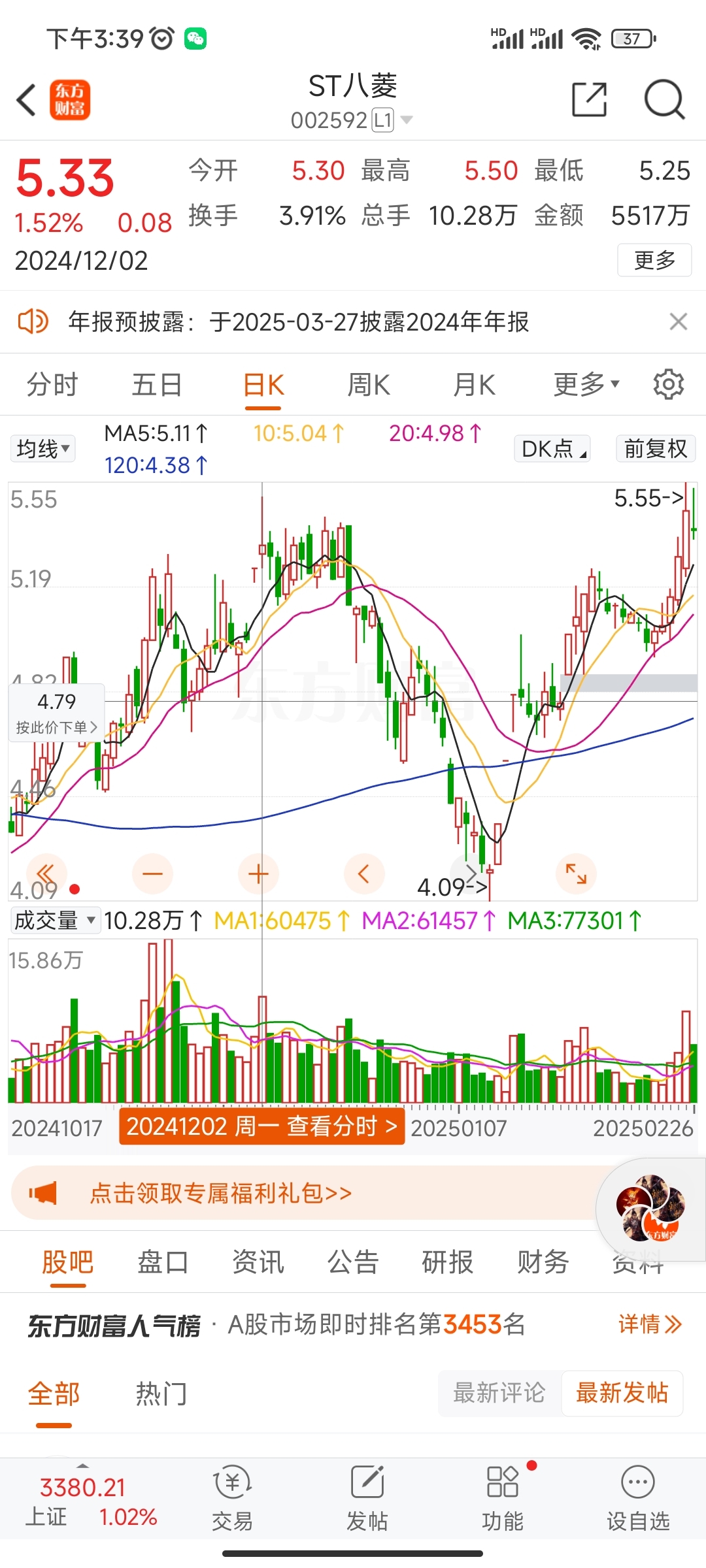 $ST八菱(SZ002592)$ 今天收射击之星最高5.55元跟去年12月的5.5元形成双顶了,接下来又要跌回5元了,顾老太不定增完80不会突破5.5元