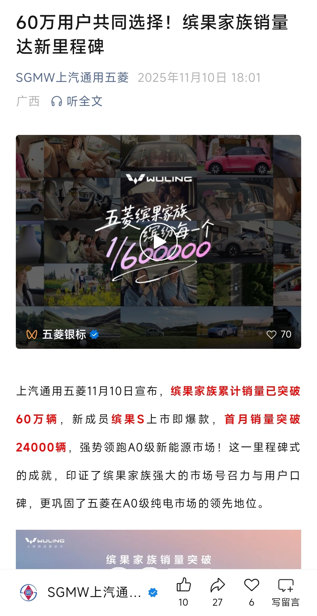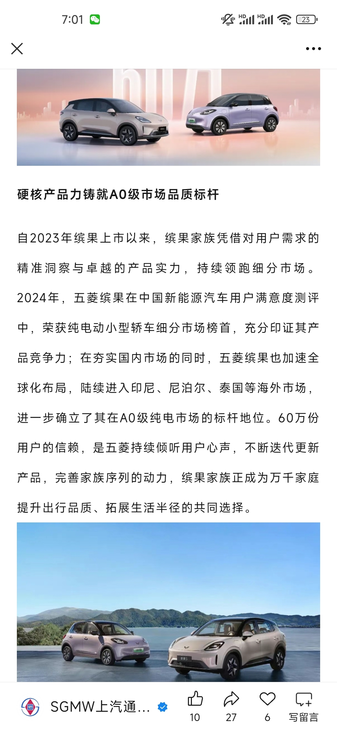 $ST八菱(SZ002592)$ 2024年,五菱缤果在中国新能源汽车用户满意度测评中,荣获纯电动小型轿车细分市场榜首,充分印证其产品竞争力;在夯实国内市场的同时,五菱缤果也加速全球化布局,陆续进入印尼、尼泊尔、泰国等海外市场,进一步确立了其在A0级纯电市场的标杆地位。