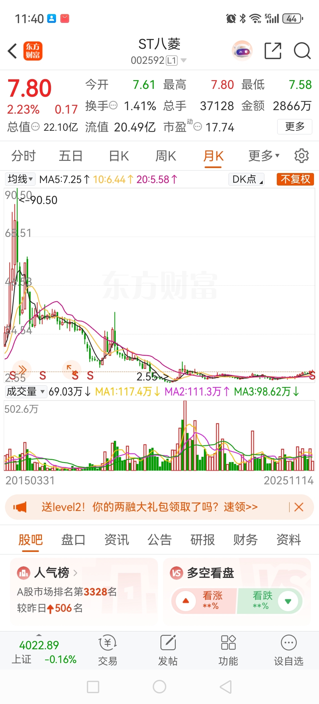 $ST八菱(SZ002592)$ 月线级别看长期,八菱处于历史低位,由于子公司负责人违规担保被st而下跌,基本面良好,负债率只有24.62%,净利率接近毛利率,高达20%,说明管理有效,各种费用低;净资产收益率达10%。三场诉讼已胜两场,最后一场性质相同,胜诉在望,摘帽预期强;小盘股易拉升,股本只有2.8亿,只有22亿市值,长期持有必有厚报。