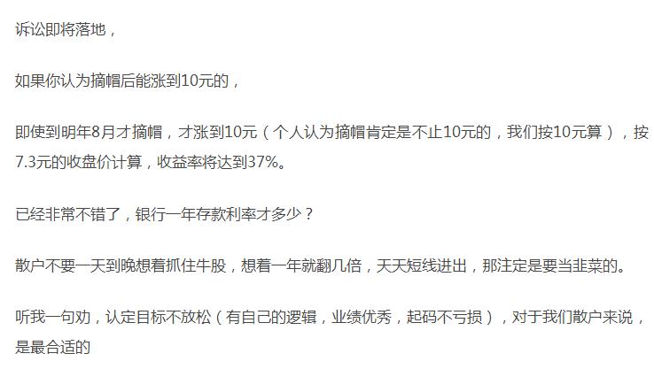 坚持就是胜利,一定坚持到诉讼落地、摘帽,15元是最低目标,20元也唾手可得。