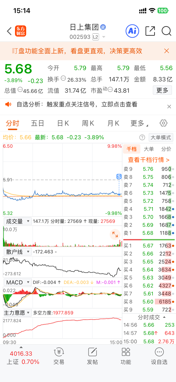 $日上集团(SZ002593)$ 6啊,卡我成本线玩啊,出一半明天做t,明天我陪你哦老庄,别拉的太快,先打下去,让我蹭蹭,不会太疼的