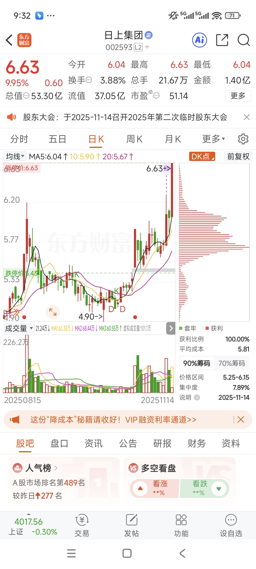 $日上集团(SZ002593)$ 前天才加入自选,还没买呢。