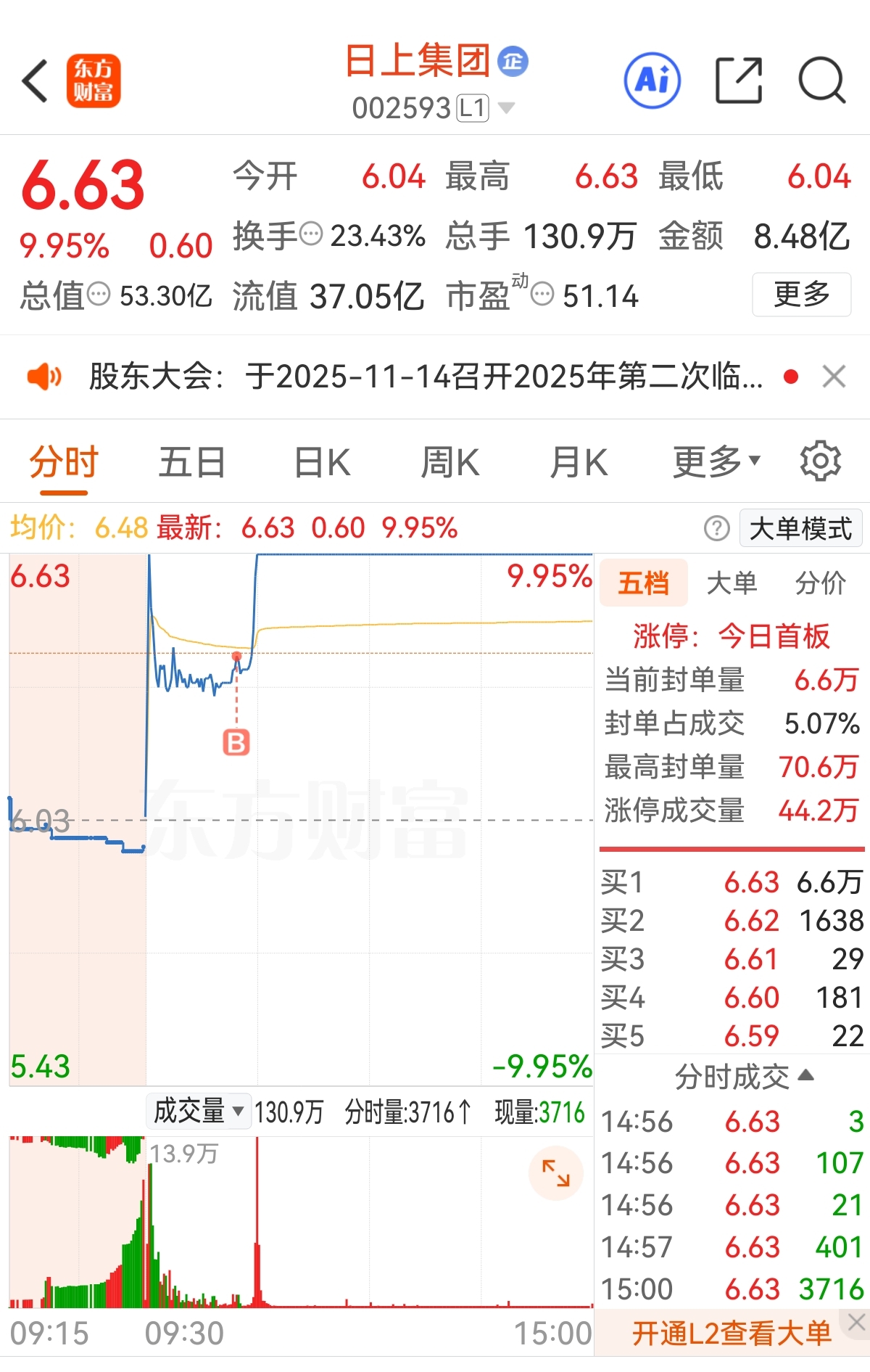 $日上集团(SZ002593)$ 今天进场,运气不错,福建板块表现强势。低位补涨好标的。
