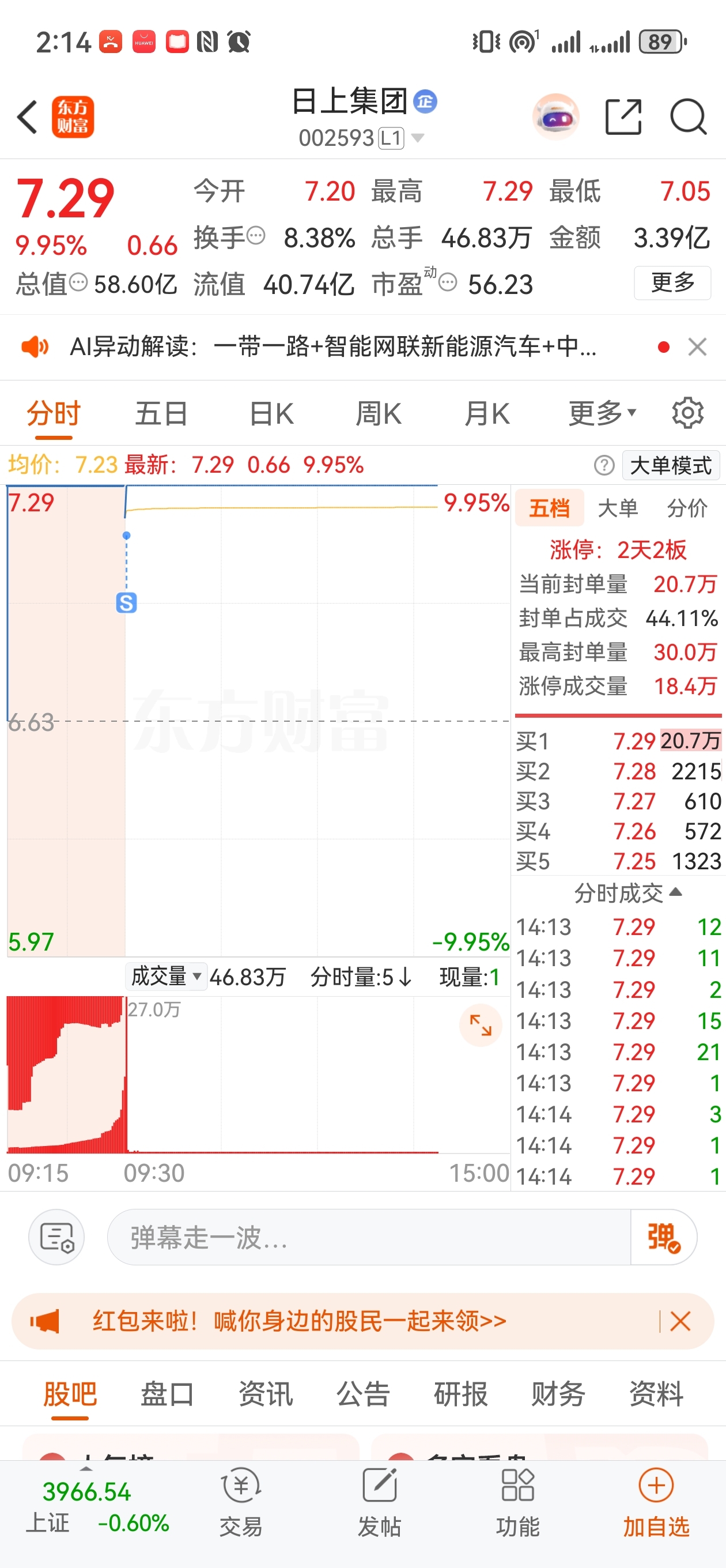 $日上集团(SZ002593)$ 这手速慢一秒就封包板