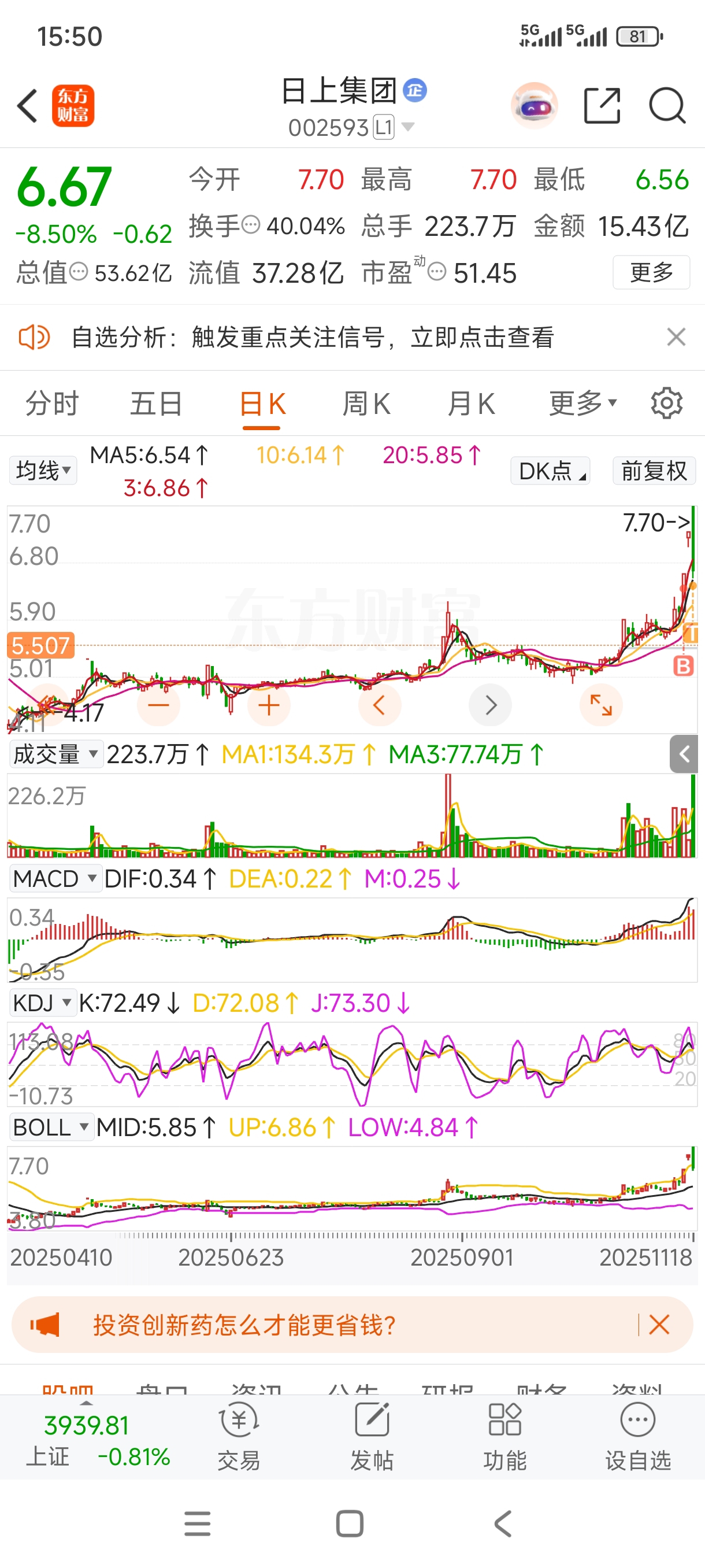 $日上集团(SZ002593)$ 巨阴暴跌,盈利锐减。