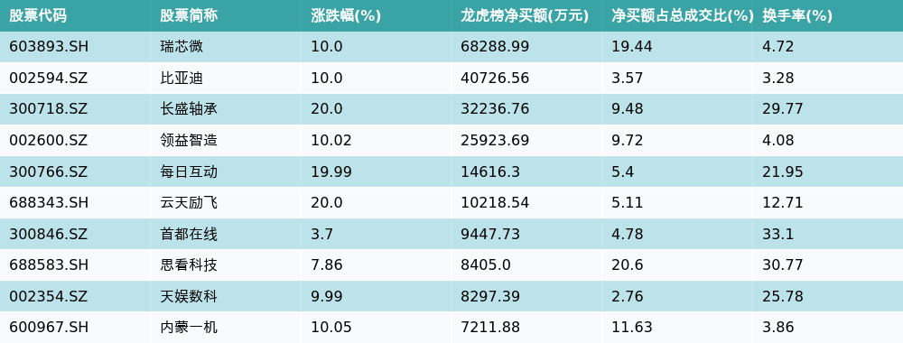 南方财经2月6日电,南财金融终端数据显示,因当日异动登上龙虎榜的个股中,资金净买入最多的前三位分别是瑞芯微(603893.SH)、比亚迪(002594.SZ)与长盛轴承(300718.SZ)。其中排名第一的瑞芯微净买额达6.83亿元,占总成交金额的19.44%。瑞芯微当日收盘上涨10.0%,换手率为4.72%,净买入额前10个股详情见下图:
