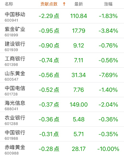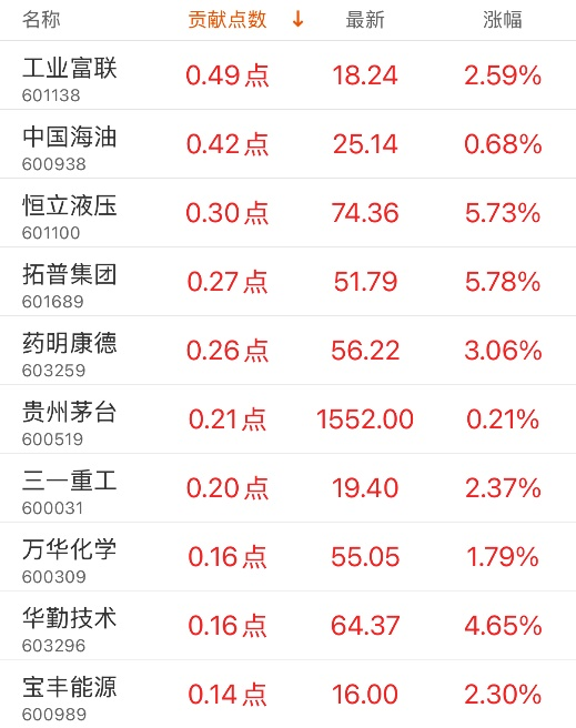 对上证指数贡献点数最多的个股是工业富联,贡献0.49点,该股当日涨2.59%,收盘价18.24元;拖累点数最多的个股是中国移动,拖累2.29点,该股当日跌1.83%,收盘价110.84元。