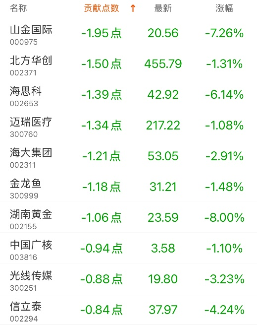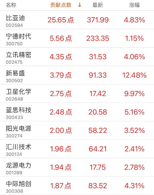 对深证成指贡献点数最多的个股是比亚迪,贡献25.65点,该股当日涨4.83%,收盘价371.99元;拖累点数最多的个股是山金国际,拖累1.95点,该股当日跌7.26%,收盘价20.56元。