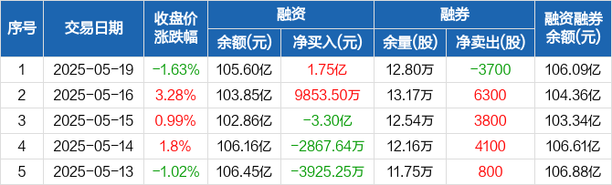 比亚迪:融资净买入1.75亿元,两市排名第三(05-19)