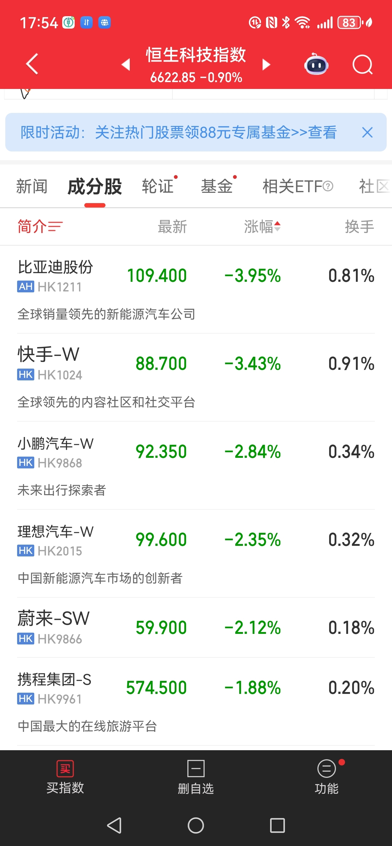 今天香港恒生科技指数下跌0.95个点,比亚迪股份下跌了近4个点,排名倒数第一名。