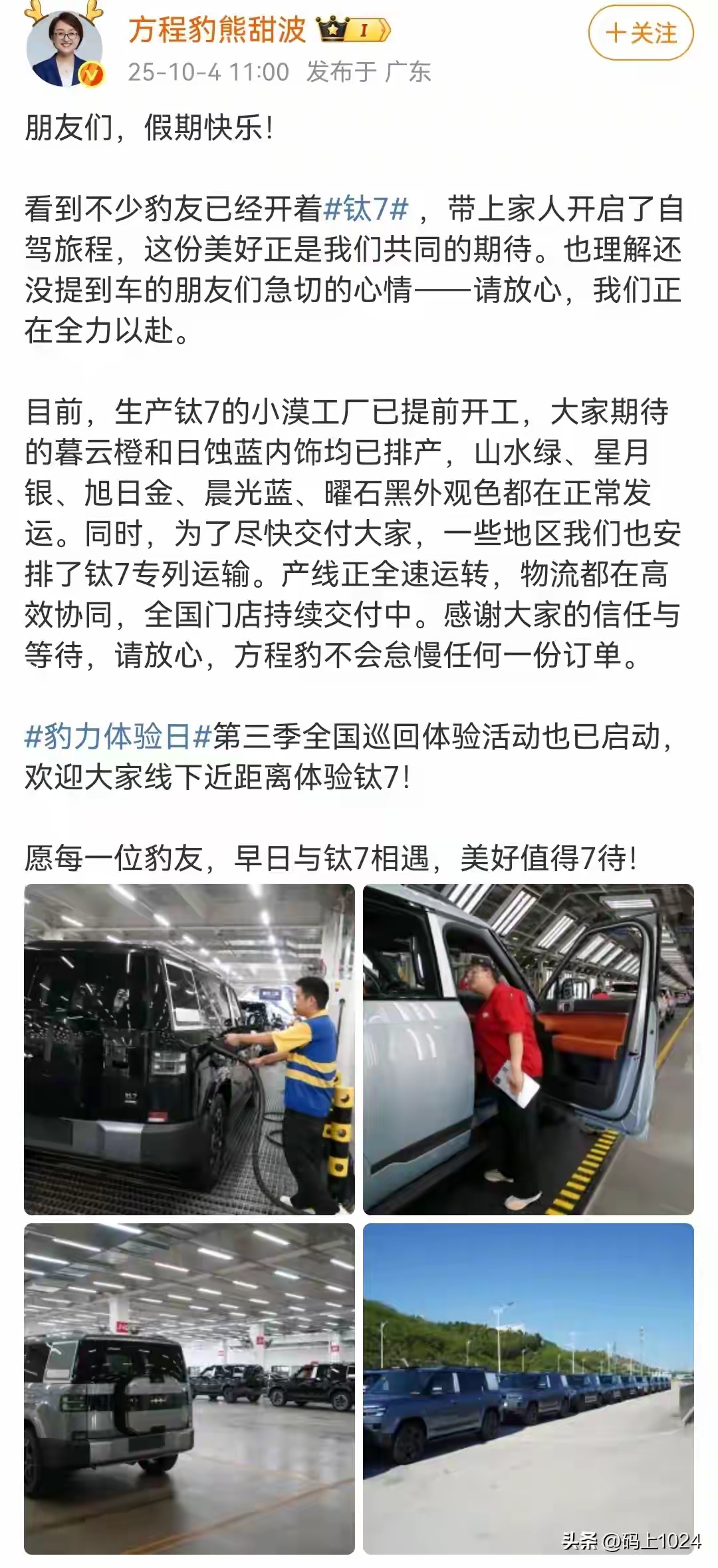 (2025年10月4日讯)方程豹的好消息来了!就在今天(10月4日),方程豹事业部的“掌舵人”熊甜波对外发声,透露了关于钛7这款热门新车的最新生产动态。