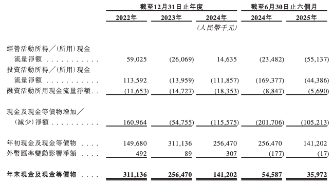 与持续亏损相伴的还有公司经营现金流“失血”。2023年和2025年上半年,公司经营活动所用现金流量净额分别为-0.26亿元和-0.55亿元,流动性压力凸显。